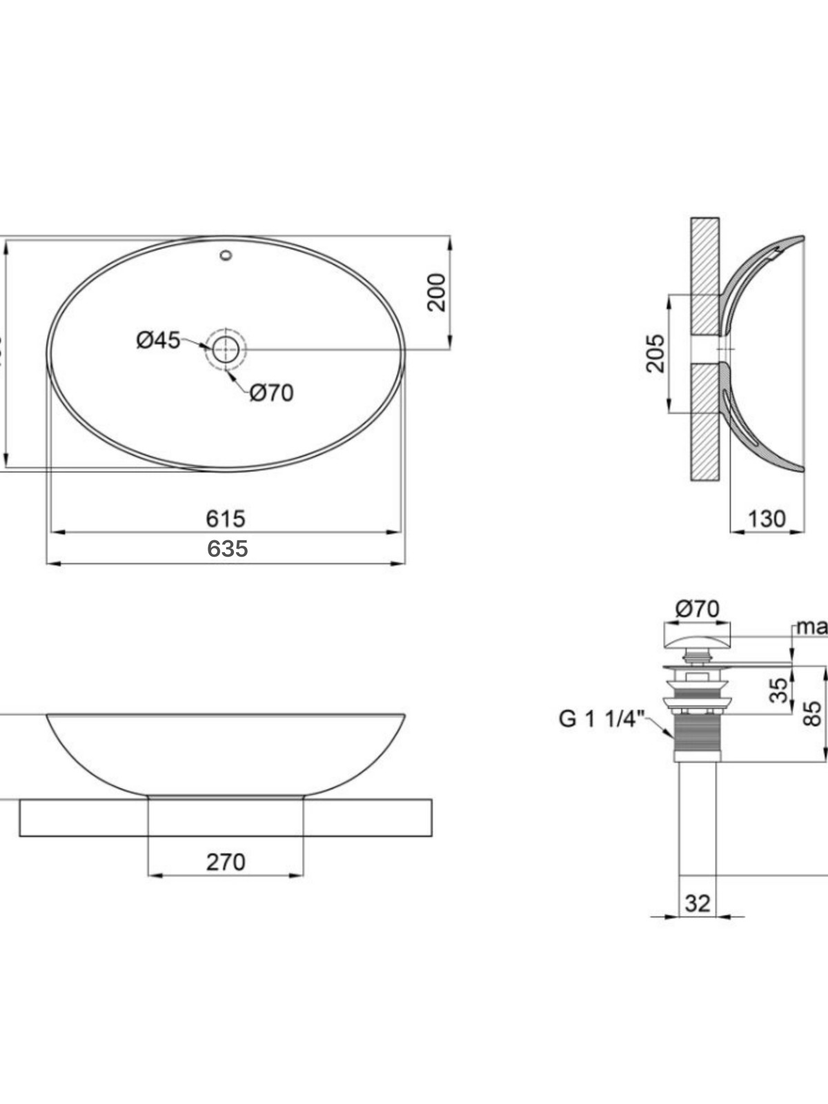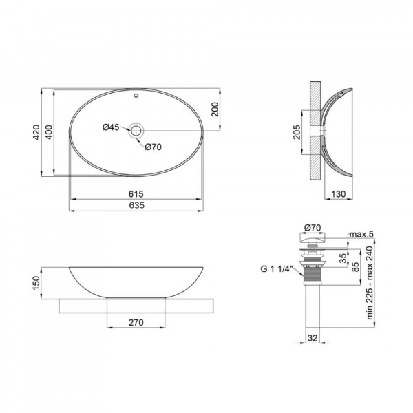 Габаритні розміри виробу (ШхГхВ), мм: 635x420x150 - раковина; 70х70х225 - донный клапан
