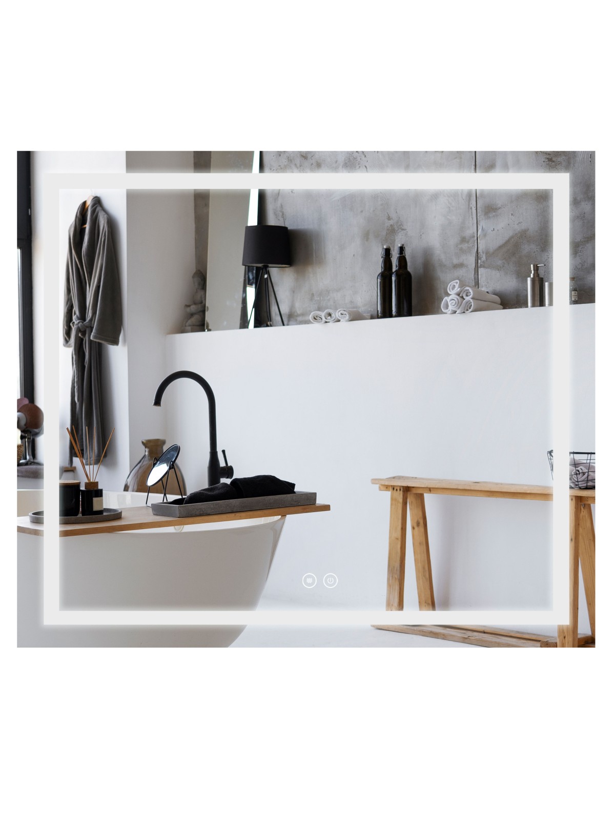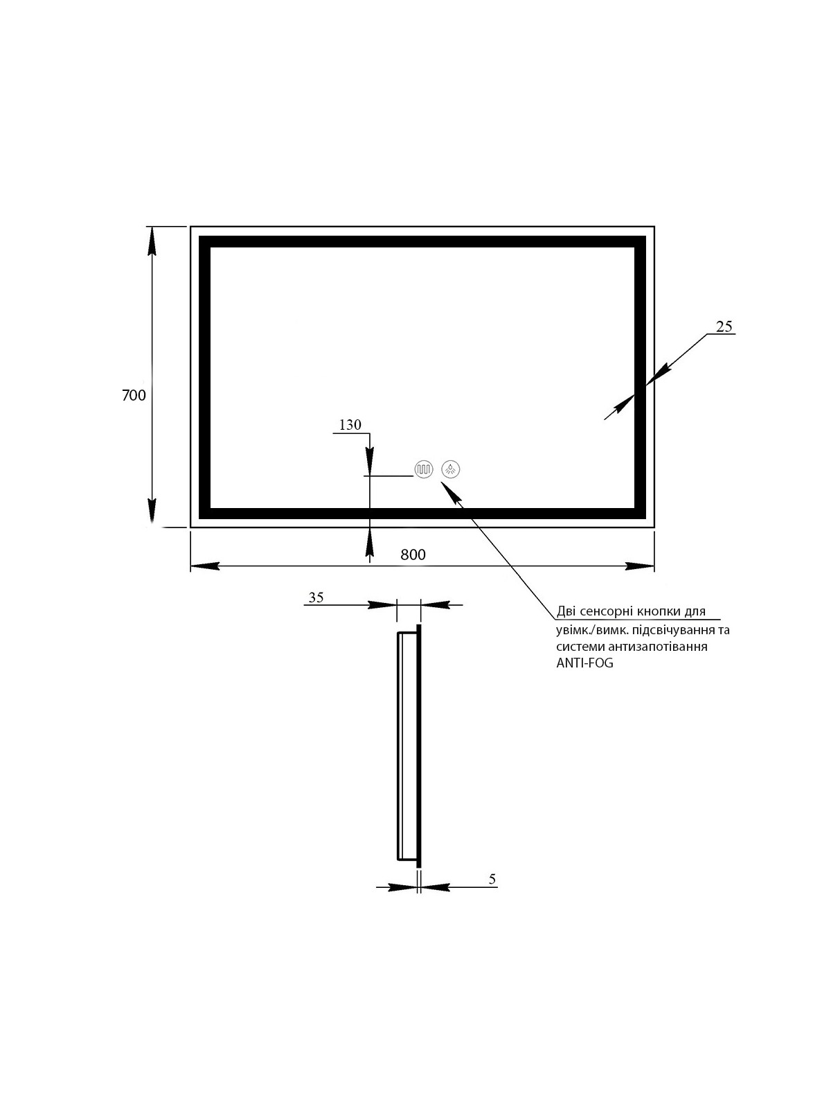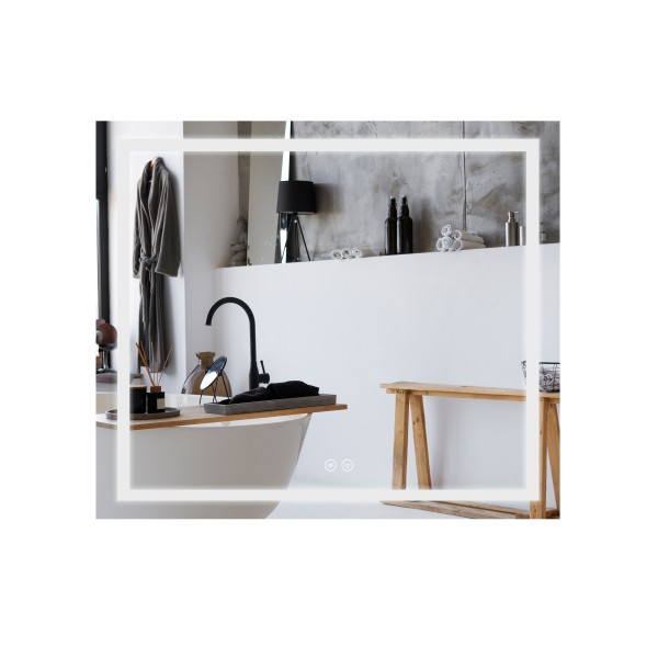 Дзеркало Qtap Mideya з антизапотіванням 800х700 QT2078NCF8070W укомплектовано світлодіодною LED стрічкою з рівним насиченим світінням холодного білого кольору. LED стрічка не створює негативного впливу на зір людини. У дзеркалі передбачена функція ANTI-FOG namp;#8211; захист від запотівання. Управління здійснюється двома сенсорними кнопками на передній частині дзеркала, диммер дозволяє регулювати яскравість підсвічування.