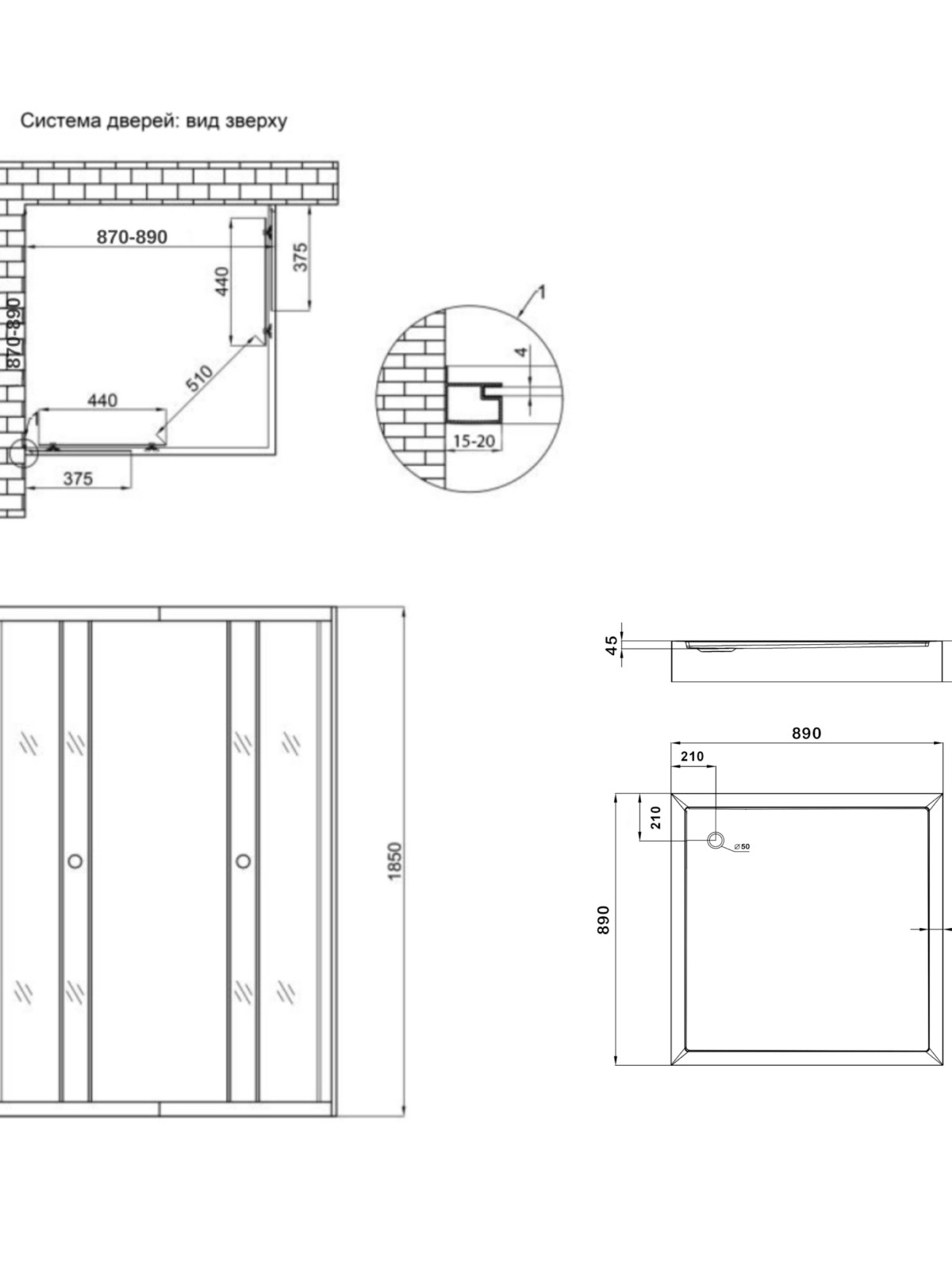 Матеріал: Скло; алюміній – профіль; ABS пластик – ручки; акрил - піддон