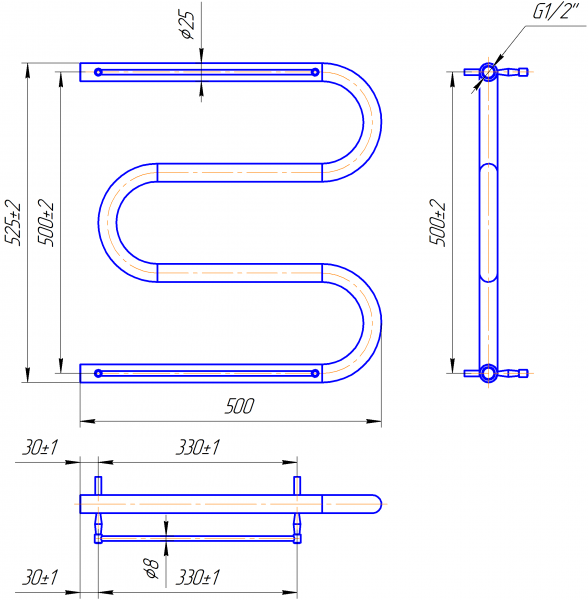 Рушникосушарка "Маріо" Змійка 25 525х600/500 + полички золото. Розміри: висота - 520 мм, ширина - 600 мм, глибина 105 мм, міжцентрова відстань для підключення - 500 мм, діаметр підключення G1/2'''. Варіанти підключення: нижнє, діагональне та бічне. Кількість ребер - 4. Виготовлена з полірованої нержавіючої сталі без хромування. Для всесезонної роботи водяну модель можна переобладнати на комбіновану, встановивши ТЕН, рекомендована потужність . Сумісні аксесуари: поворотні полиці та навісні гачки для збільшення функціональності. Рекомендовано підключати рушникосушарку за допомогою кранів Маріо. Гарантія - 50 років в закритій системі опалення, 5 років у централізованій, на фабування (декоративне покриття) - 2 роки.