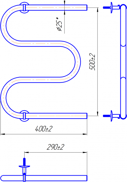 Рушникосушарка "Маріо" Змійка 25 525х400/500 чорний мат. Розміри: висота - 525 мм, ширина - 400 мм, глибина 75 мм, міжцентрова відстань для підключення - 500 мм, діаметр підключення G1/2'''. Варіанти підключення: нижнє, діагональне та бічне. Кількість ребер - 4. Виготовлена з полірованої нержавіючої сталі без хромування. Для всесезонної роботи водяну модель можна переобладнати на комбіновану, встановивши ТЕН, рекомендована потужність . Сумісні аксесуари: поворотні полиці та навісні гачки для збільшення функціональності. Рекомендовано підключати рушникосушарку за допомогою кранів Маріо. Гарантія - 50 років в закритій системі опалення, 5 років у централізованій, на фабування (декоративне покриття) - 2 роки.
