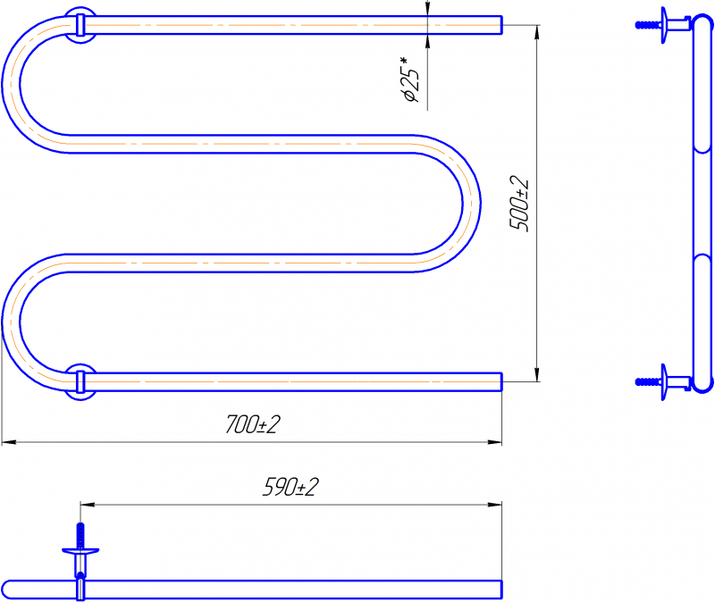 Рушникосушарка "Маріо" Змійка 25 525х700/500 золото. Розміри: висота - 525 мм, ширина - 700 мм, глибина 75 мм, міжцентрова відстань для підключення - 500 мм, діаметр підключення G1/2'''. Варіанти підключення: нижнє, діагональне та бічне. Кількість ребер - 4. Виготовлена з полірованої нержавіючої сталі без хромування. Для всесезонної роботи водяну модель можна переобладнати на комбіновану, встановивши ТЕН, рекомендована потужність . Сумісні аксесуари: поворотні полиці та навісні гачки для збільшення функціональності. Рекомендовано підключати рушникосушарку за допомогою кранів Маріо. Гарантія - 50 років в закритій системі опалення, 5 років у централізованій, на фабування (декоративне покриття) - 2 роки.