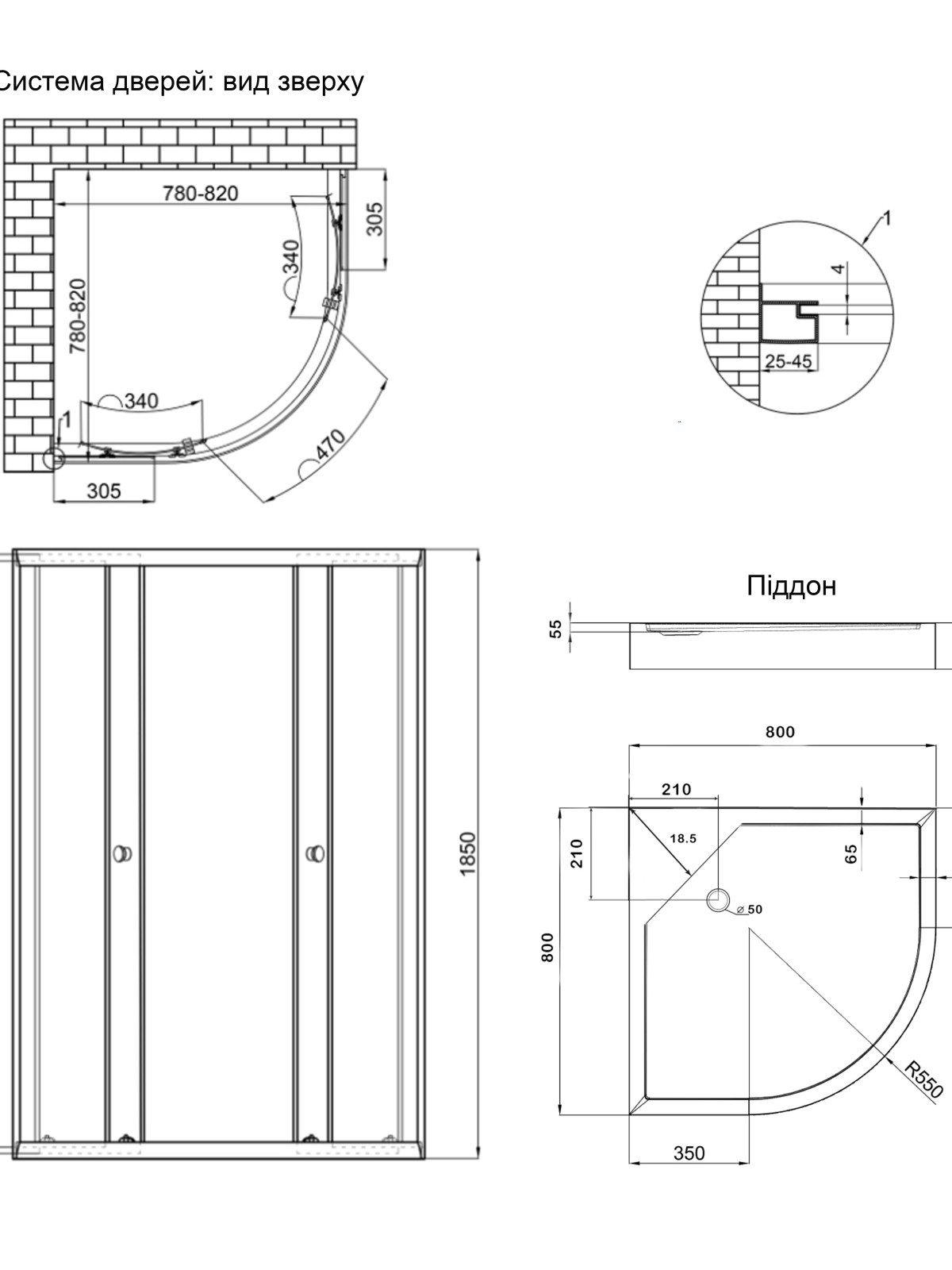 Габаритні розміри виробу (ШхГхВ), мм: 780-820х780-820х2010; 800х800х150