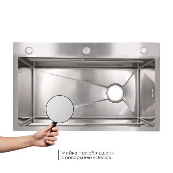 Інтегрована мийка Lidz Handmade з поверхнею Decor Honeycomb. Збільшена товщина сталі 3,0/1,0 мм робить модель максимально міцною, а фактурна поверхня виділяє її в інтер’єрі. Простора чаша зручна для миття великого посуду.