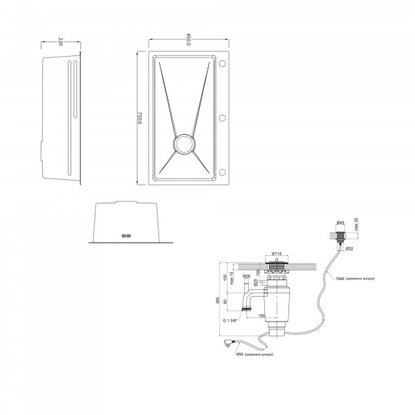 Матеріал: Нержавіюча сталь – мийка; метал - подрібнювач