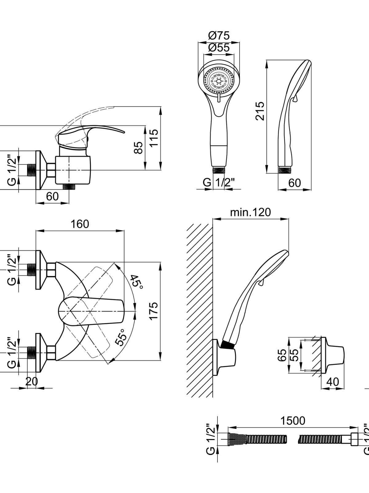 Комплектація: Змішувач, душовий шланг, лійка для ручного душу, тримач для ручного душу. Кріплення.