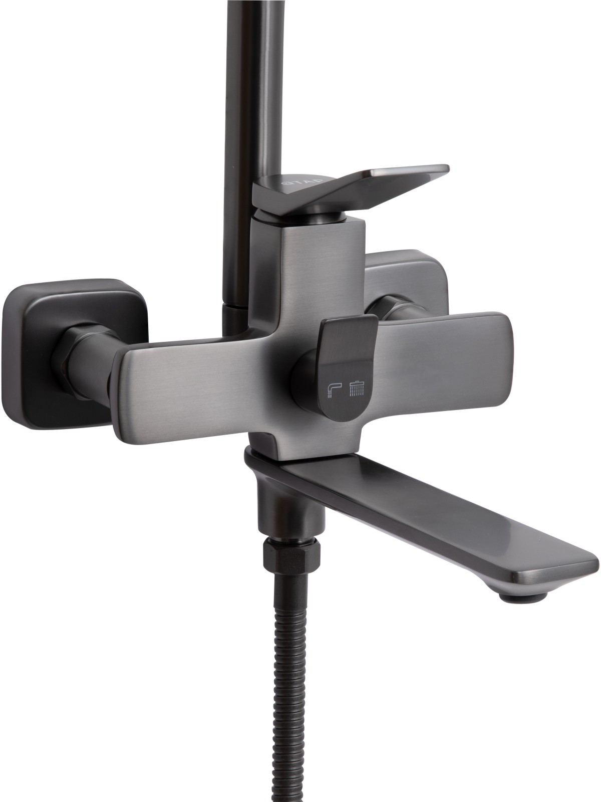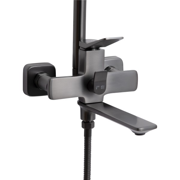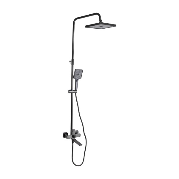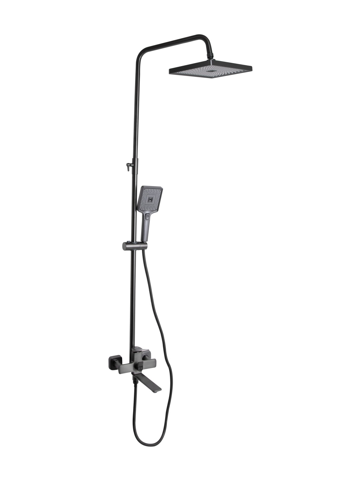 Комплектація: Змішувач, кронштейн для верхнього душу, лійка для верхнього душу, кронштейн для ручного душу, лійка для ручного душу, душовий шланг, душова стійка, деталі кріплення.