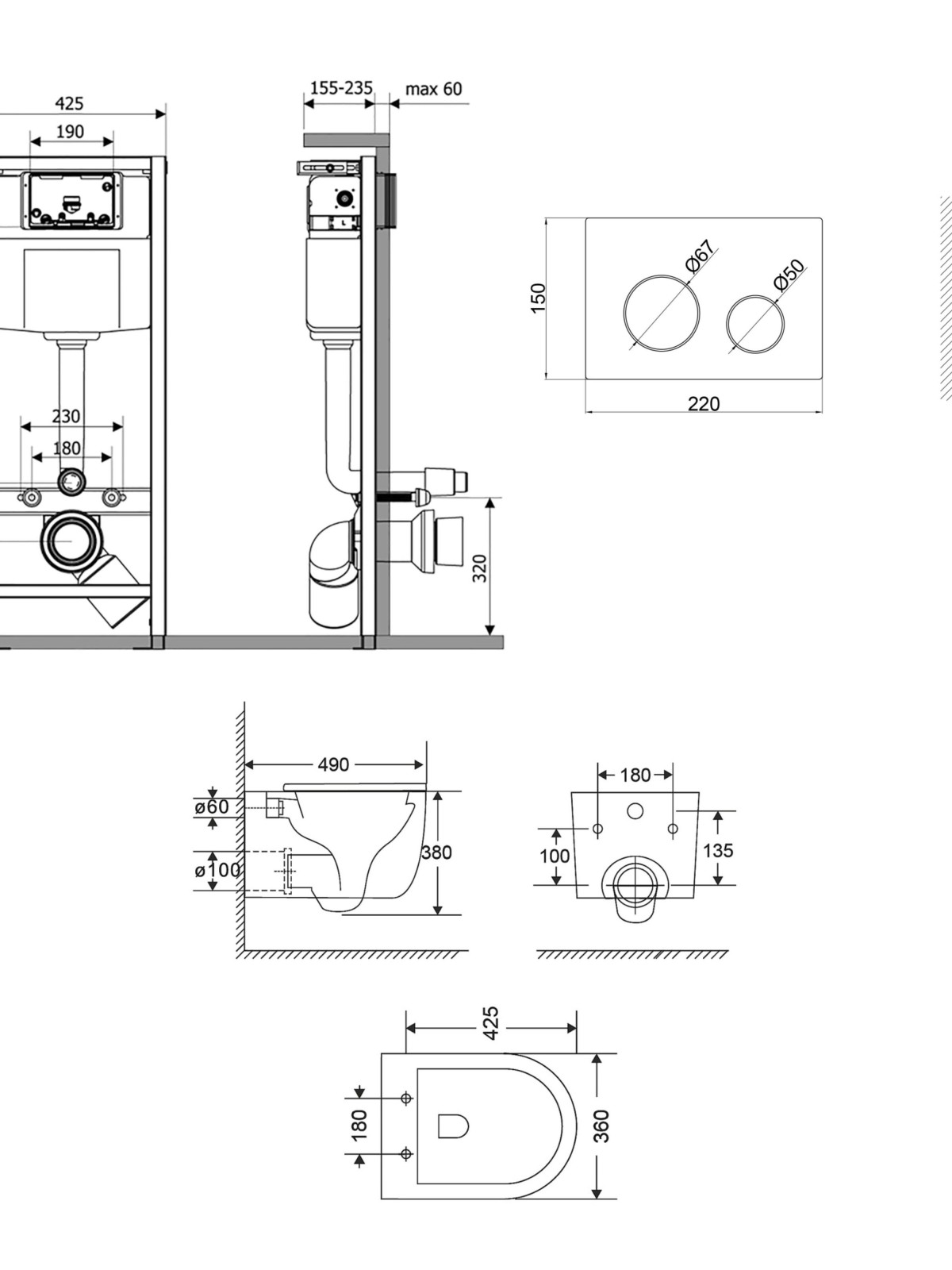 Габаритні розміри виробу (ШхГхВ), мм: Інсталяція: 1280х425х185. Панель змиву: 150х220х32. Унітаз: 380х360х490.