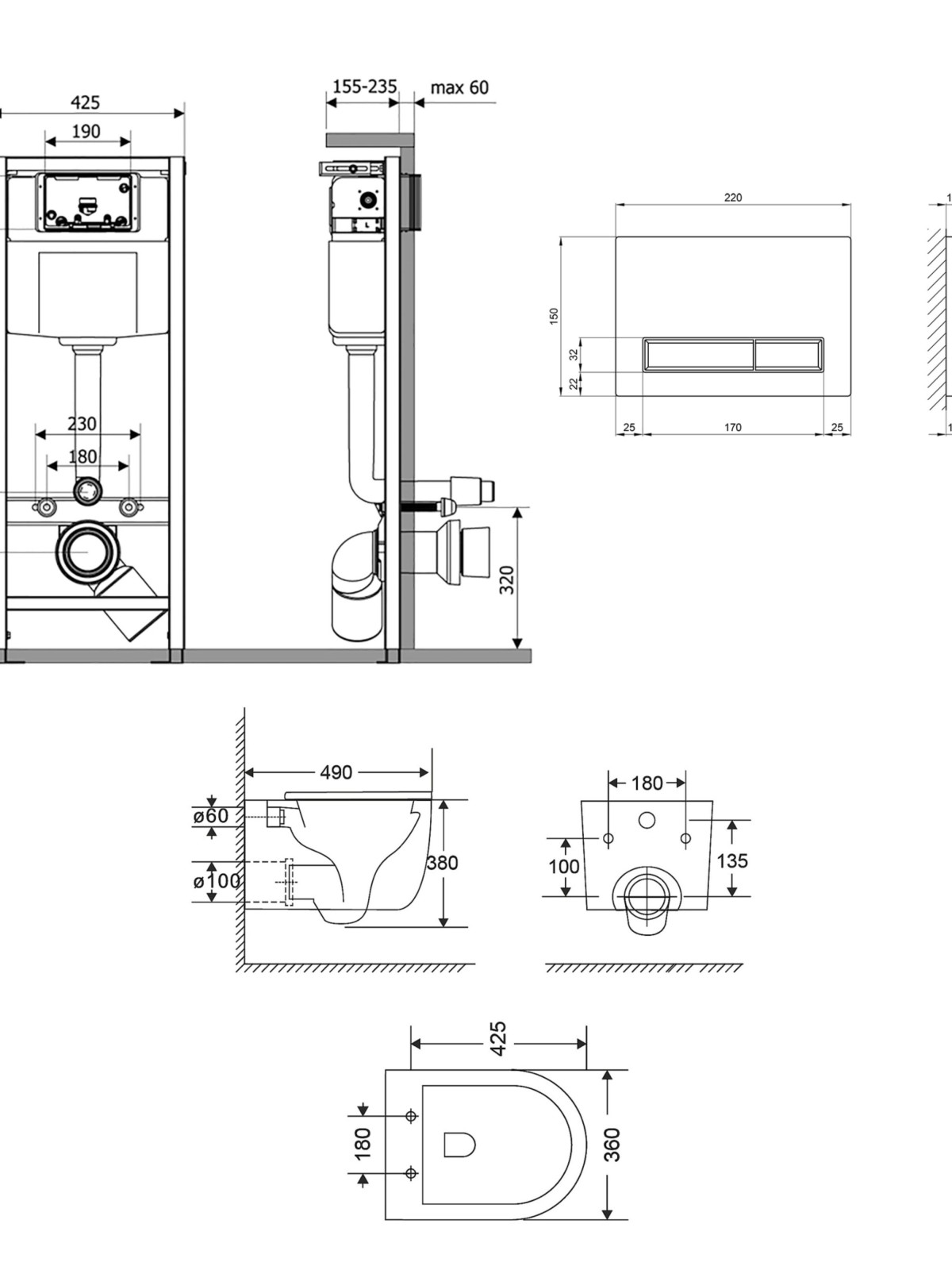 Габаритні розміри виробу (ШхГхВ), мм: Інсталяція: 1280х425х185. Панель змиву: 150x220x13. Унітаз: 380х360х490.