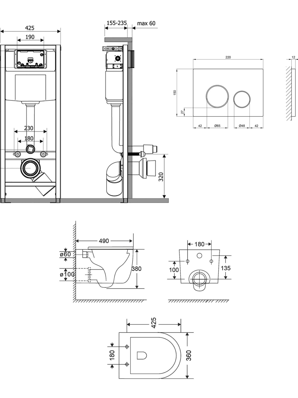 Габаритні розміри виробу (ШхГхВ), мм: Інсталяція: 1280х425х185. Панель змиву: 154x220x13. Унітаз: 380х360х490.