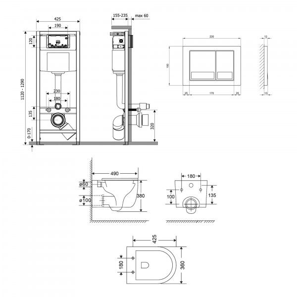 Вага брутто, кг: 11,9 – інсталяція; 0,33 – панель змиву; 27 – унітаз