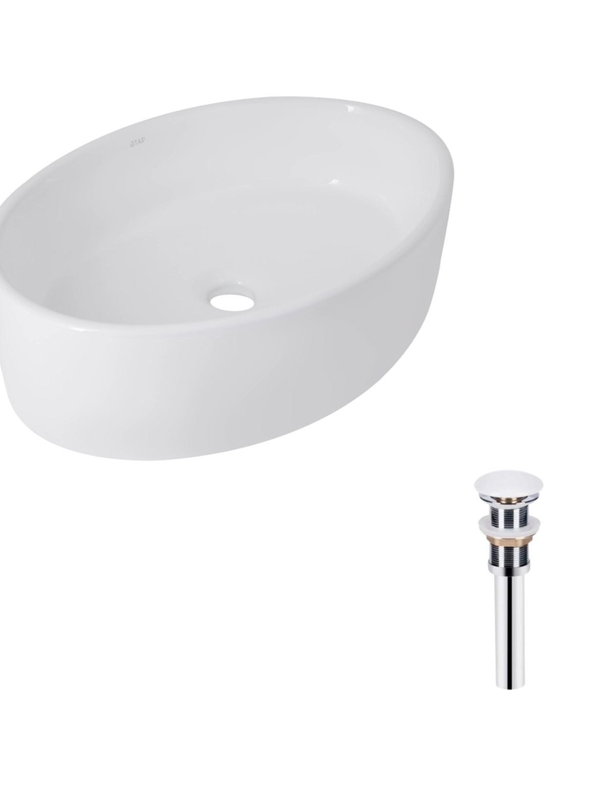 Комплект Qtap Kolibri: Раковина накладна овальна White + Донний клапан PU02: Компактна овальна раковина з білим покриттям і донним клапаном PU02. Ідеальна для невеликих приміщень завдяки своїм розмірам. Її мінімалістичний дизайн вписується в будь-який інтер'єр, а клапан гарантує безперебійний злив води.