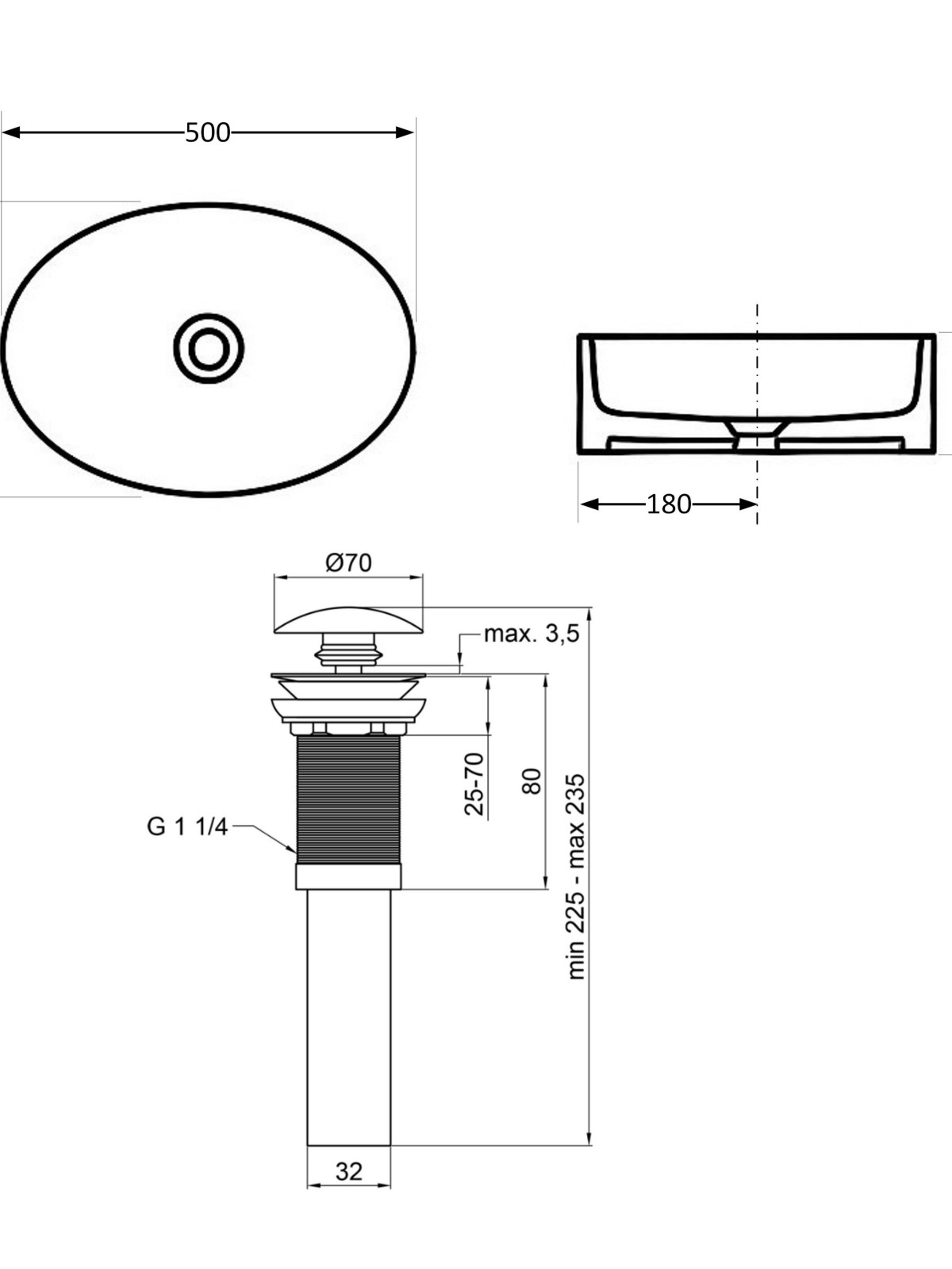Габаритні розміри виробу (ШхГхВ), мм: 505x360x140 - раковина; 70х70х225 - донный клапан