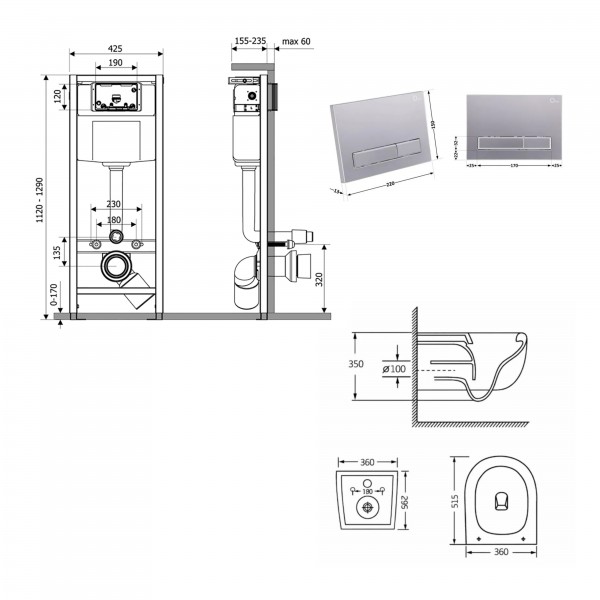Габаритні розміри виробу (ШхГхВ), мм: Унітаз: 515×360×350. Інсталяція: 425х185х1280. Панель змиву: 220х13х150.