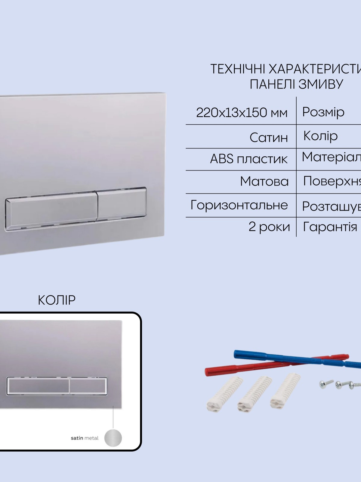 Матеріал: Метал/ABS пластик – інсталяція; ABS пластик – панель змиву; кераміка – унітаз; дюропласт – сидіння для унітазу
