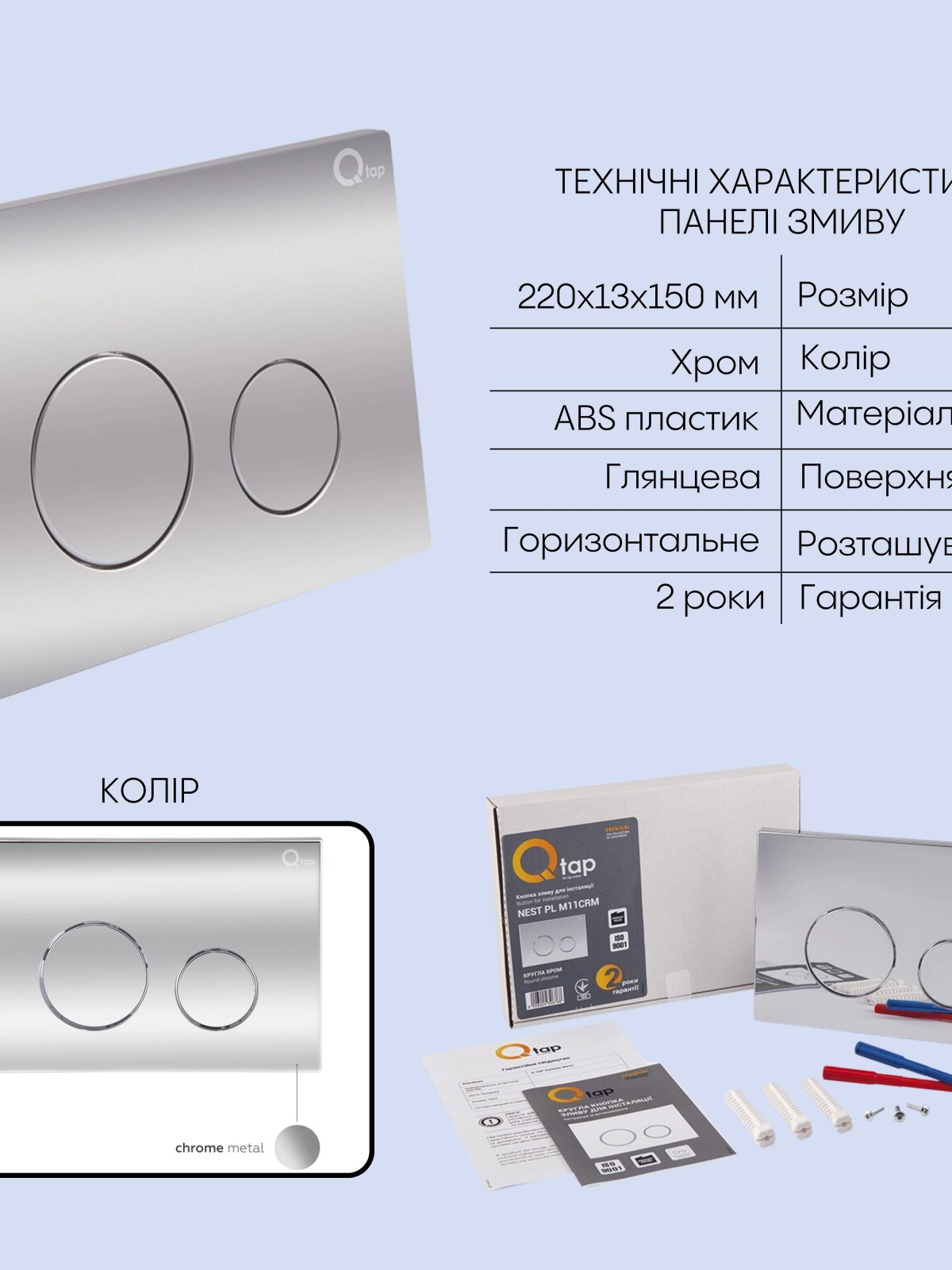 Матеріал: Метал/ABS пластик – інсталяція; ABS пластик – панель змиву; кераміка – унітаз; дюропласт – сидіння для унітазу