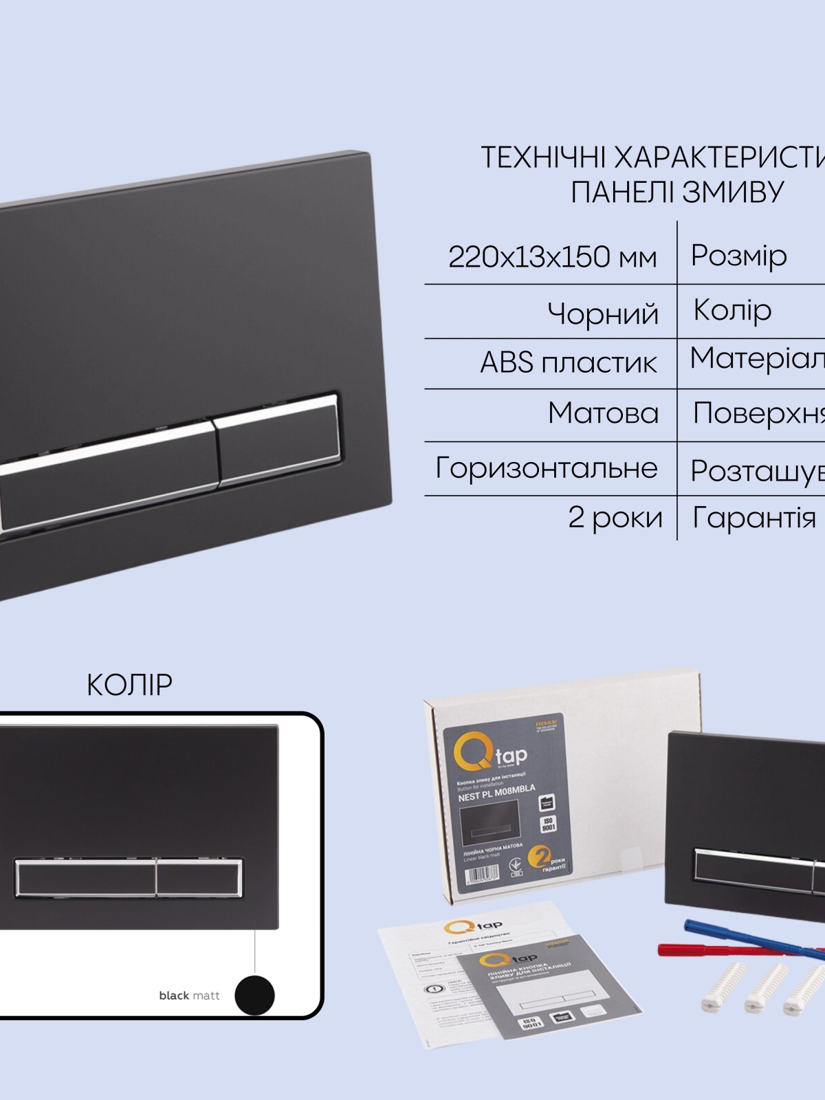 Склад набору: Інсталяція: Qtap Nest QT0133M425. Панель змиву: Qtap Nest QT0111M08V1091MB. Унітаз із сидінням: Qtap Gemini QTTAU26W49119.