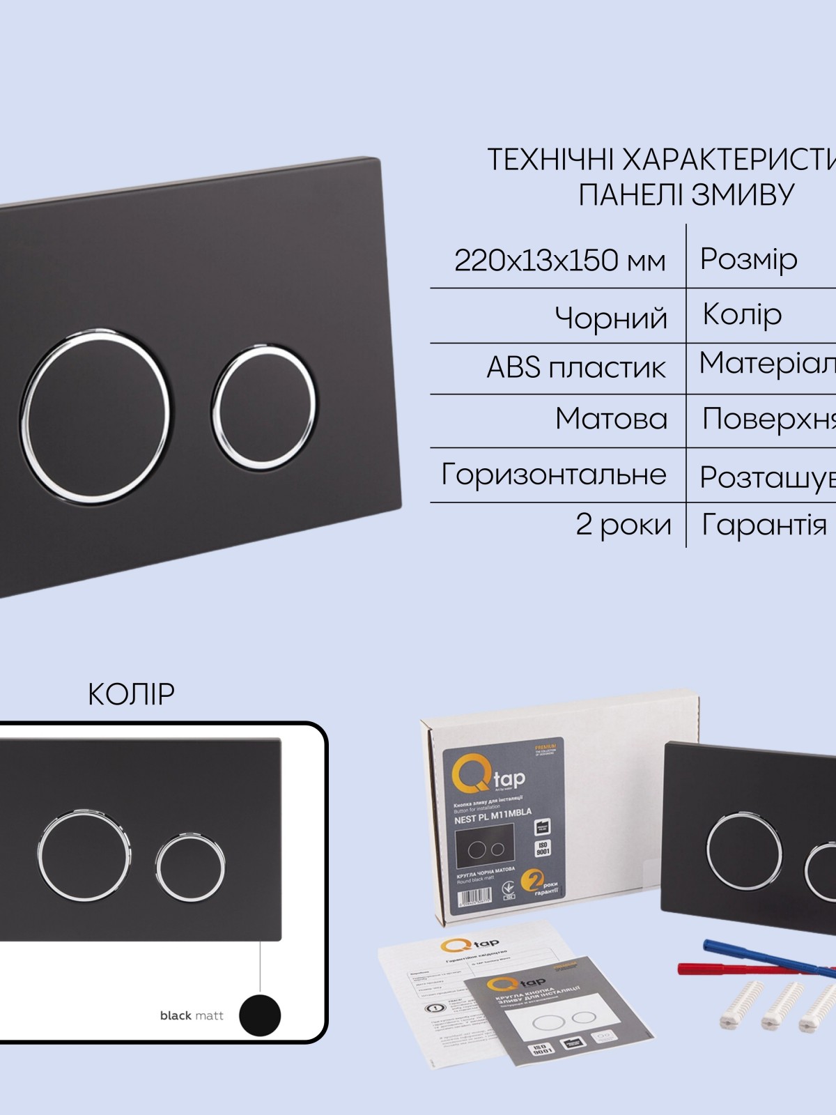 Склад набору: Інсталяція: Qtap Nest QT0133M425. Панель змиву: Qtap Nest QT0111M11V1146MB. Унітаз із сидінням: Qtap Gemini QTTAU26W49119.