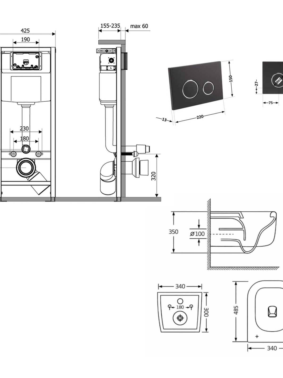 Габаритні розміри виробу (ШхГхВ), мм: Унітаз: 485х340х350. Інсталяція: 425х185х1280. Панель змиву: 220х13х150.