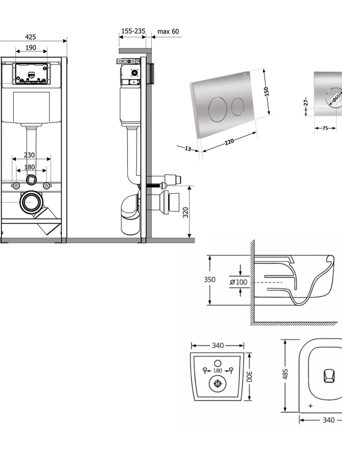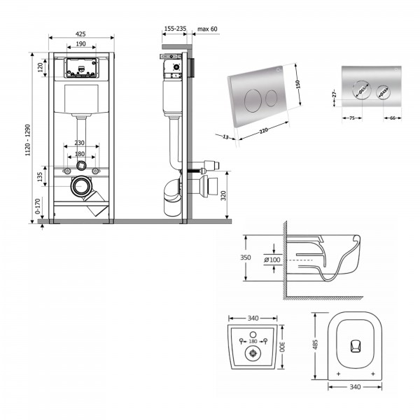 Габаритні розміри виробу (ШхГхВ), мм: Унітаз: 485х340х350. Інсталяція: 425х185х1280. Панель змиву: 220х13х150.