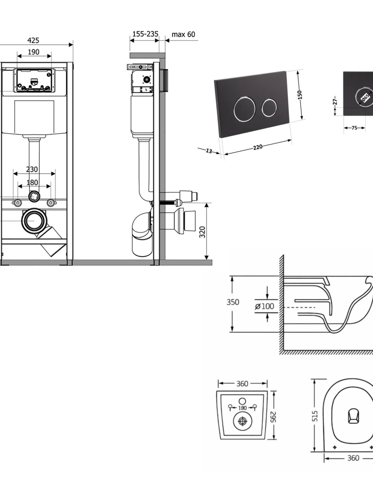 Габаритні розміри виробу (ШхГхВ), мм: Унітаз: 515×360×350. Інсталяція: 425х185х1280. Панель змиву: 220х13х150.