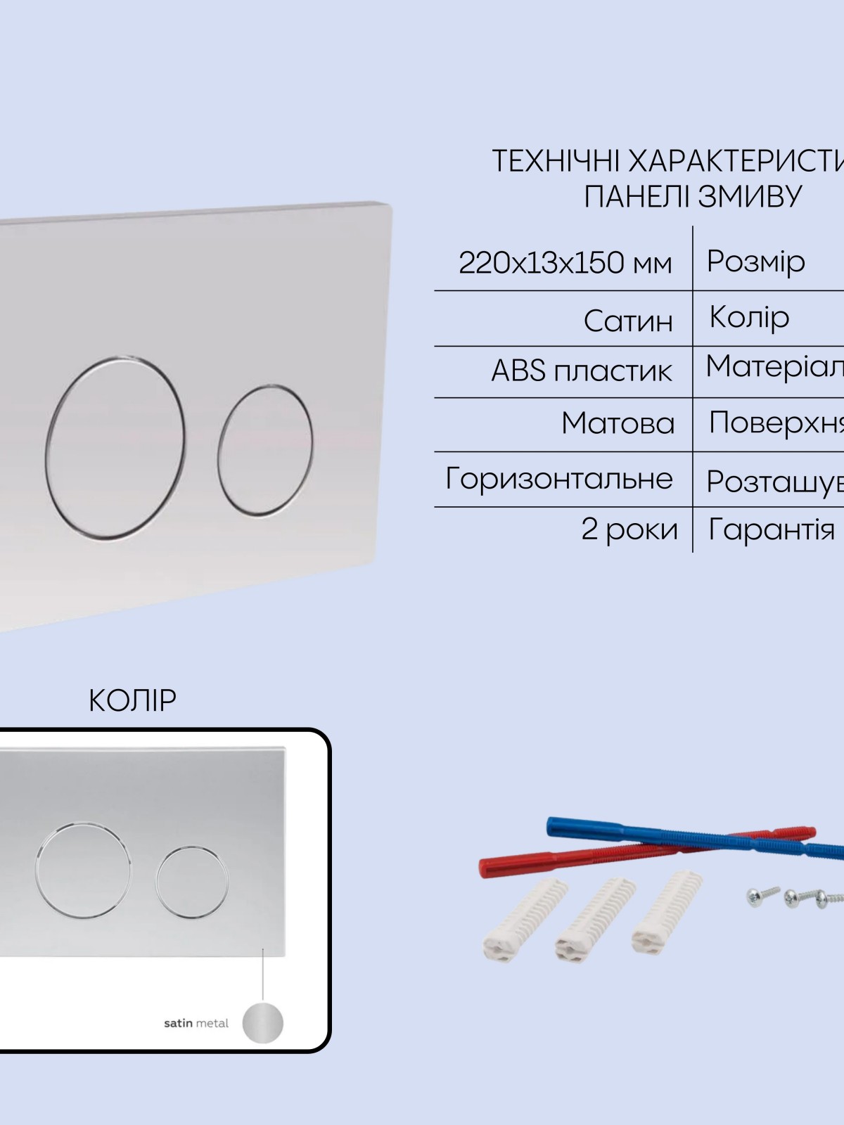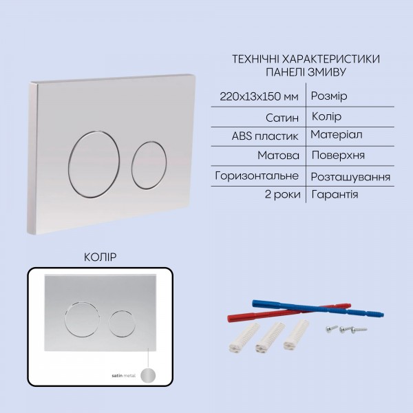 Матеріал: Метал/ABS пластик – інсталяція; ABS пластик – панель змиву; кераміка – унітаз; дюропласт – сидіння для унітазу