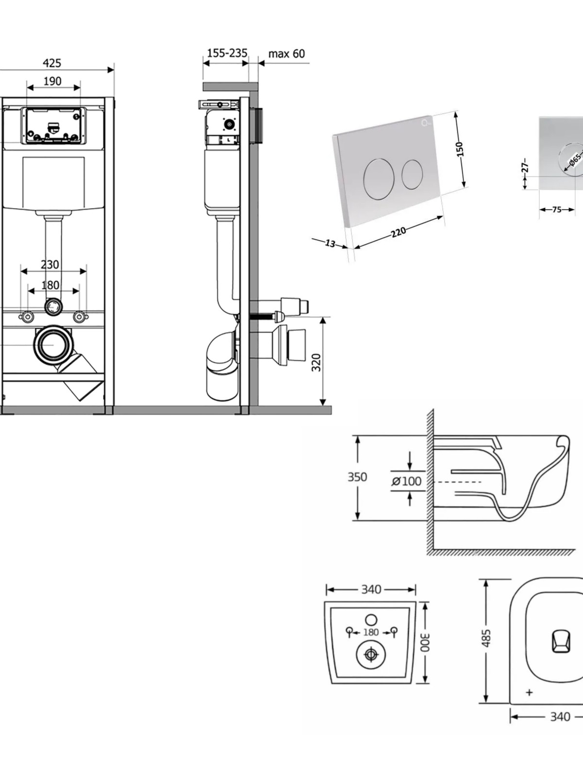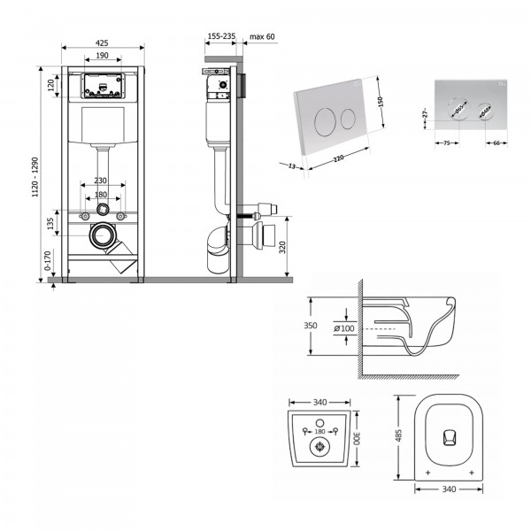 Габаритні розміри виробу (ШхГхВ), мм: Унітаз: 485х340х350. Інсталяція: 425х185х1280. Панель змиву: 220х13х150.