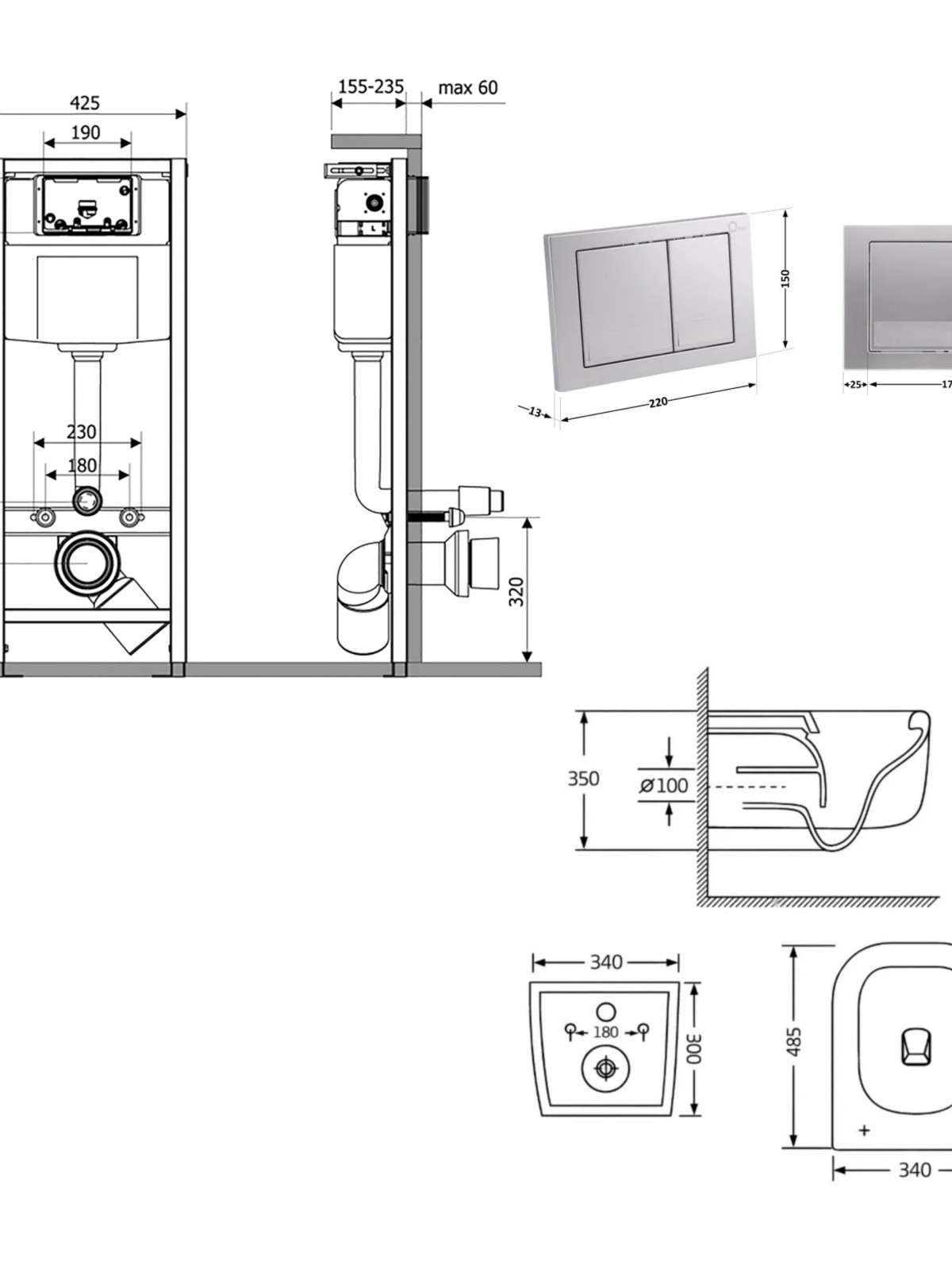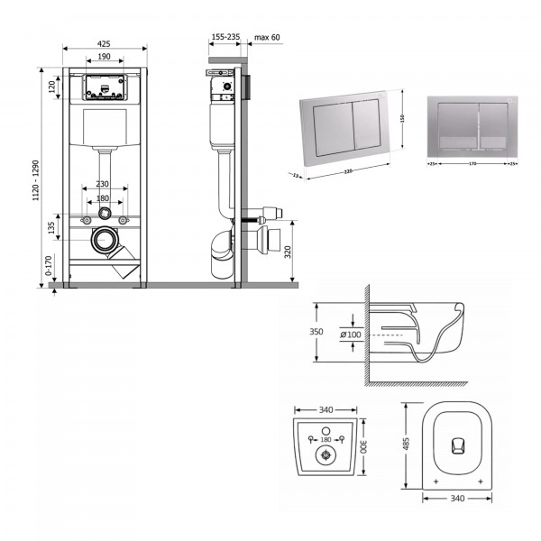 Габаритні розміри виробу (ШхГхВ), мм: Унітаз: 485х340х350. Інсталяція: 425х185х1280. Панель змиву: 220х13х150.