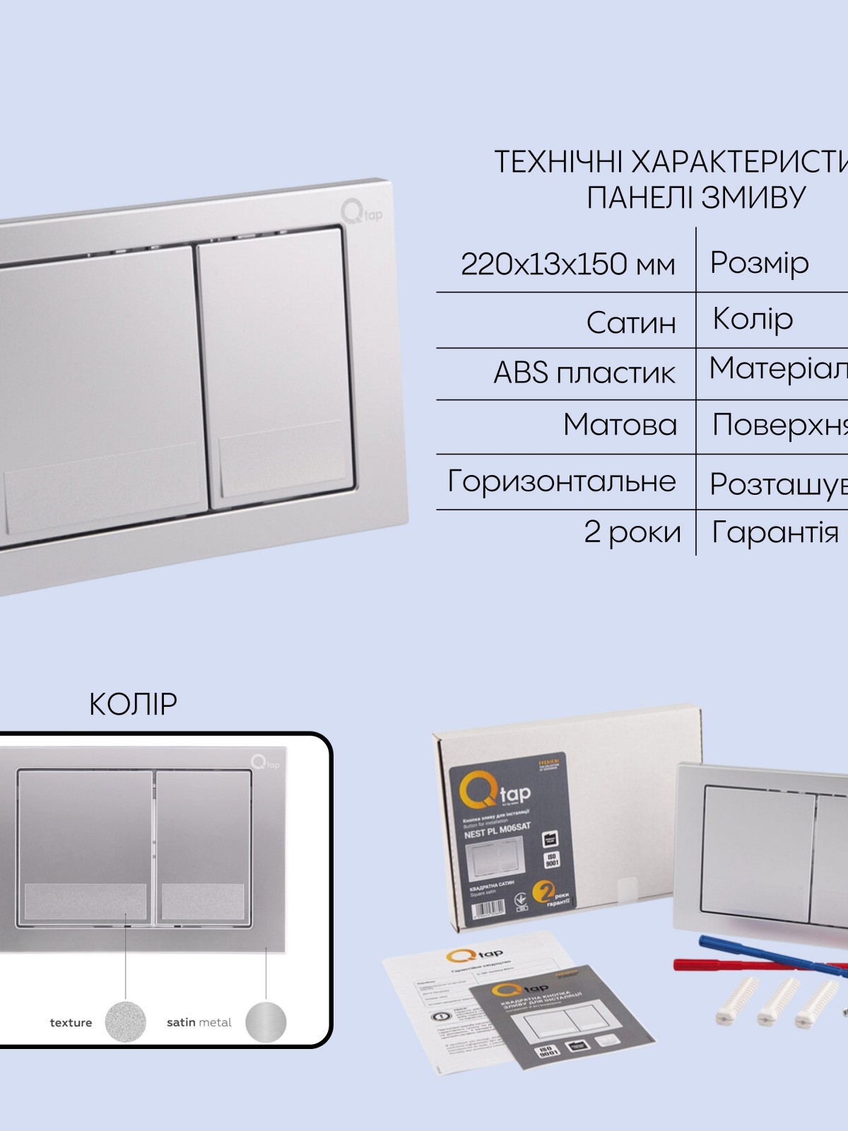 Склад набору: Інсталяція: Qtap Nest QT0133M425. Панель змиву: Qtap Nest QT0111M06029SAT. Унітаз із сидінням: Qtap Gemini QTTAU26W49119.