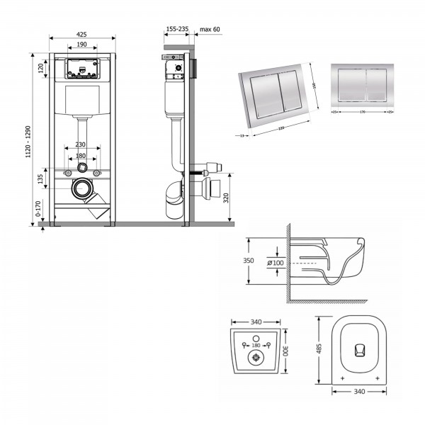 Габаритні розміри виробу (ШхГхВ), мм: Унітаз: 485х340х350. Інсталяція: 425х185х1280. Панель змиву: 220х13х150.