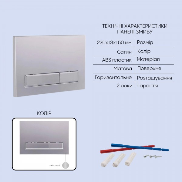 Матеріал: Метал/ABS пластик – інсталяція; ABS пластик – панель змиву; кераміка – унітаз; дюропласт – сидіння для унітазу
