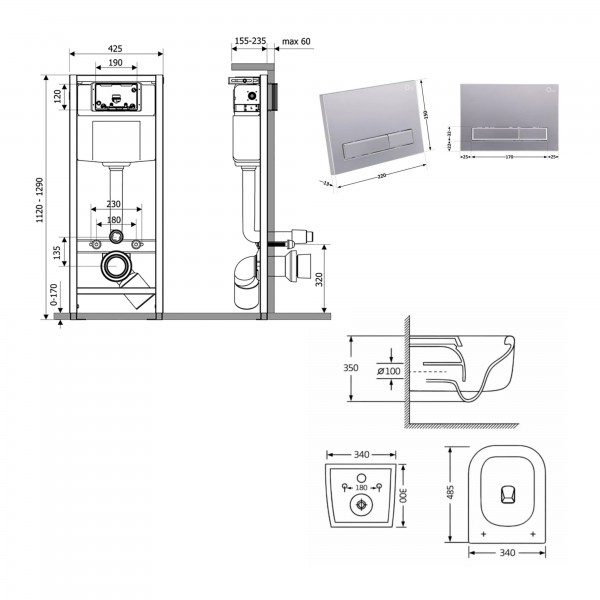 Габаритні розміри виробу (ШхГхВ), мм: Унітаз: 485х340х350. Інсталяція: 425х185х1280. Панель змиву: 220х13х150.