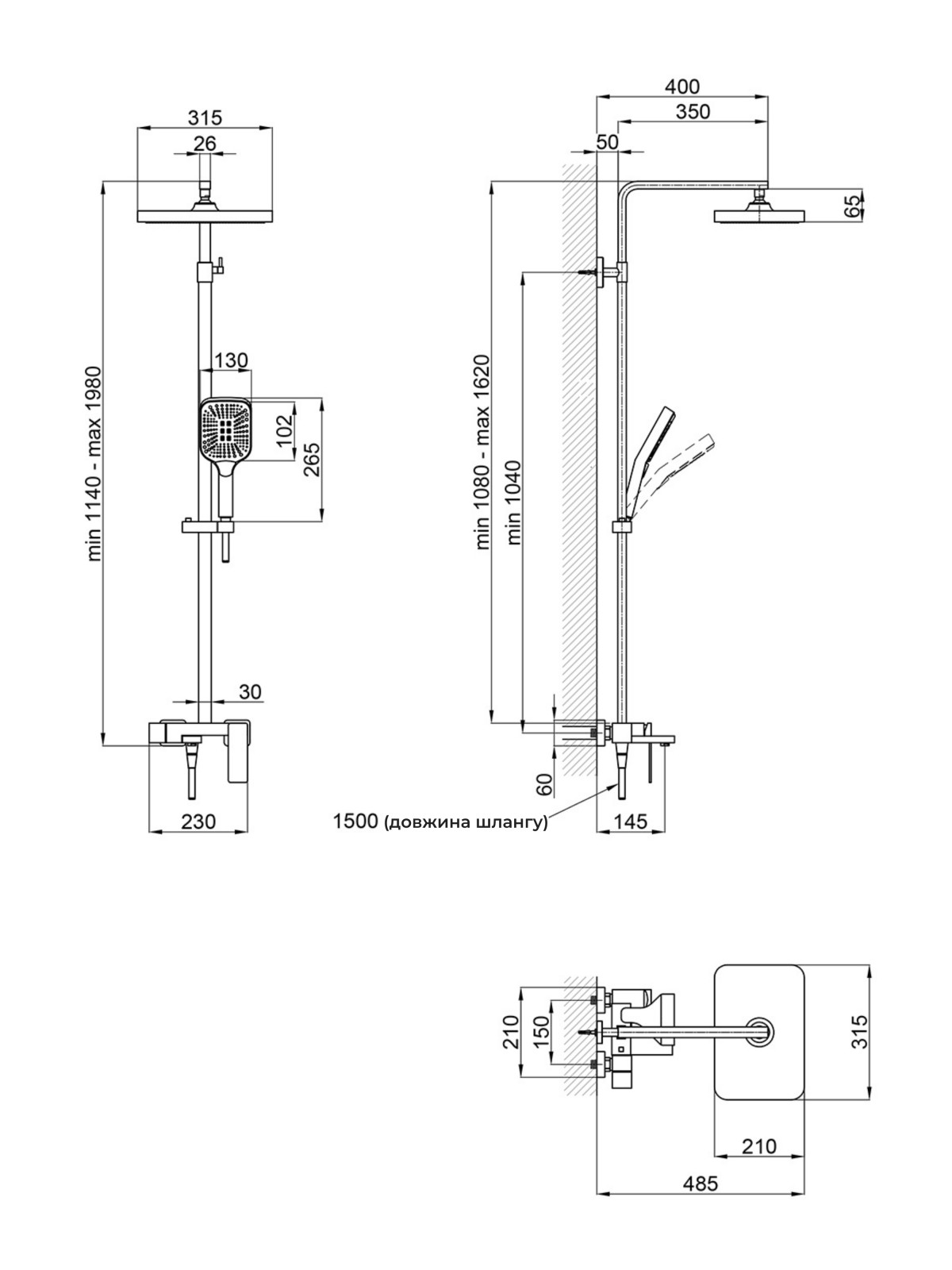 Висота душової стійки, мм: 1600