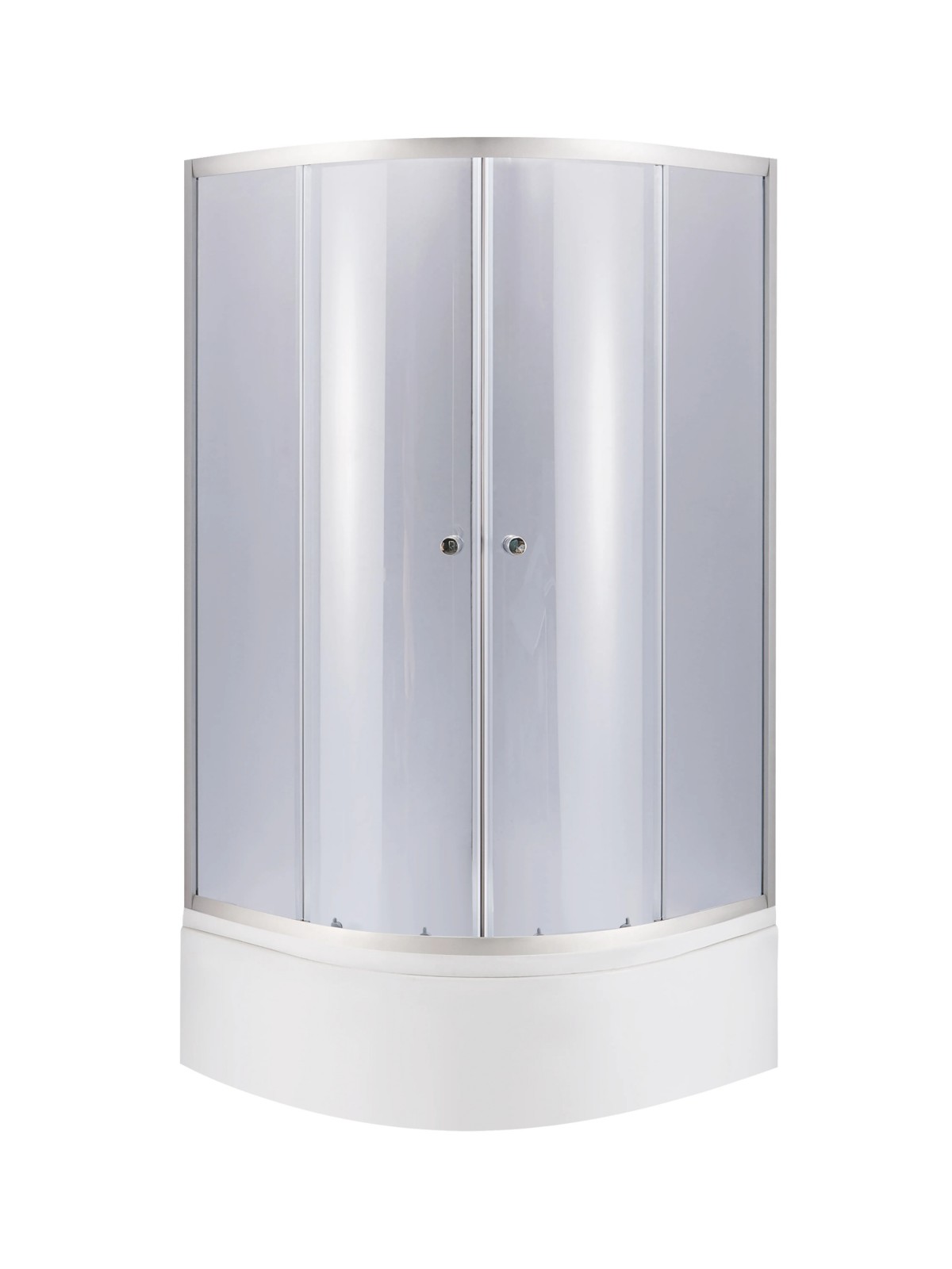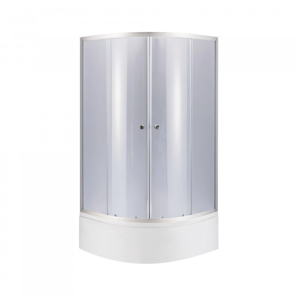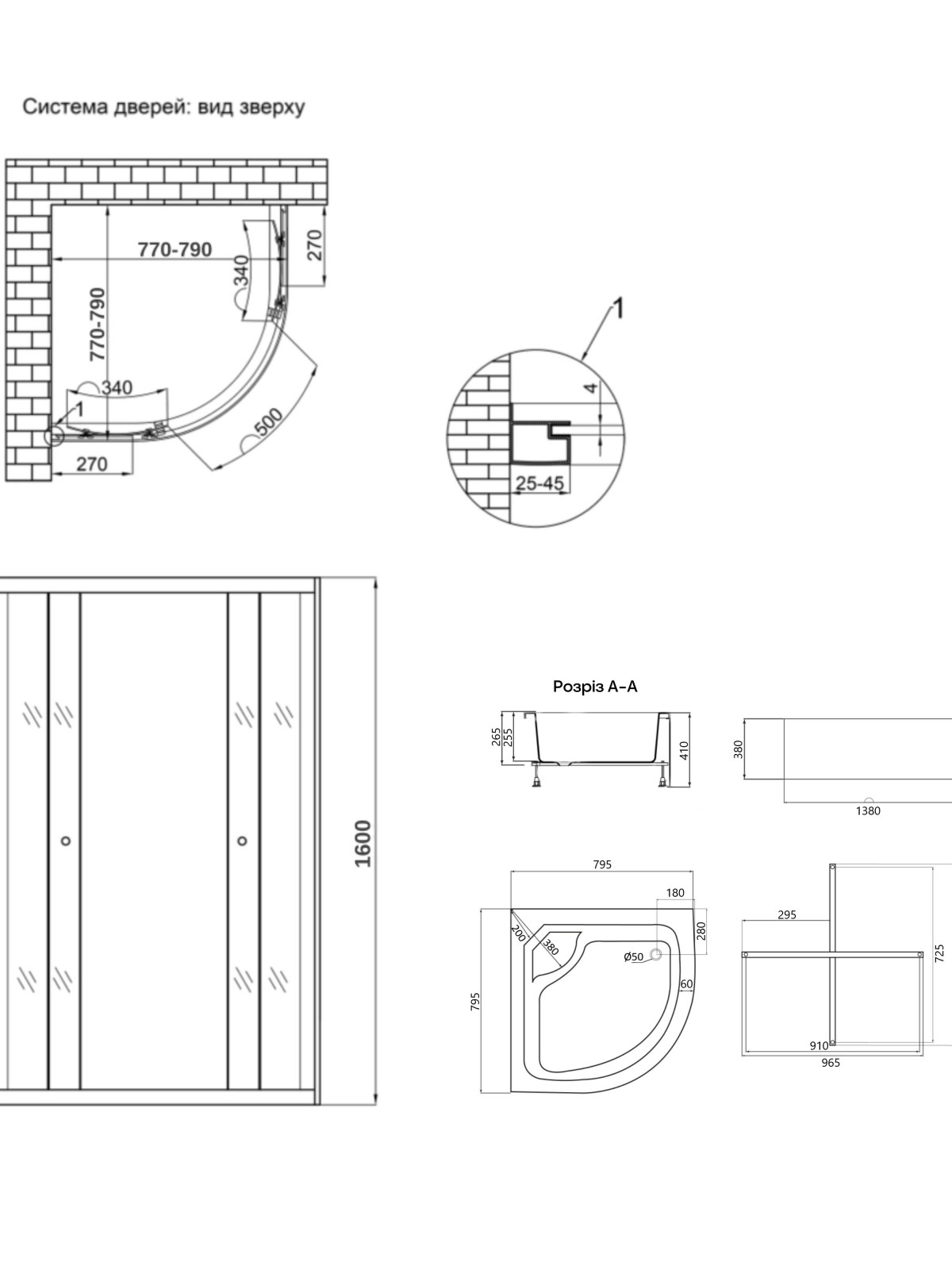Комплектація: Профіль, подвійні ролики, ручки, комплект кріпильних деталей, глухе скло, скляні двері, піддон, сифон, ніжки, панель для піддону.