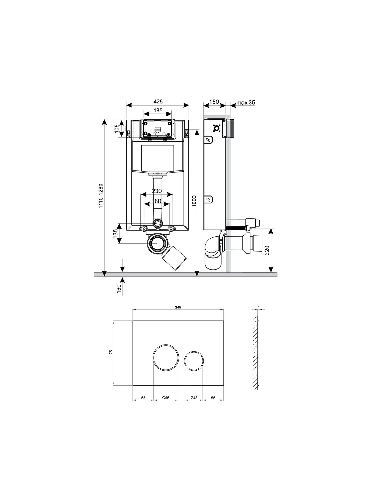 Габаритні розміри виробу (ШхГхВ), мм: Інсталяція: 425х185х1280. Панель змиву: 245х4х175.
