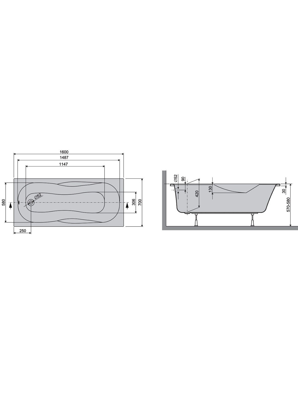LIF16070 Life Ванна 160x70 см + ніжки, біла (1 сорт)