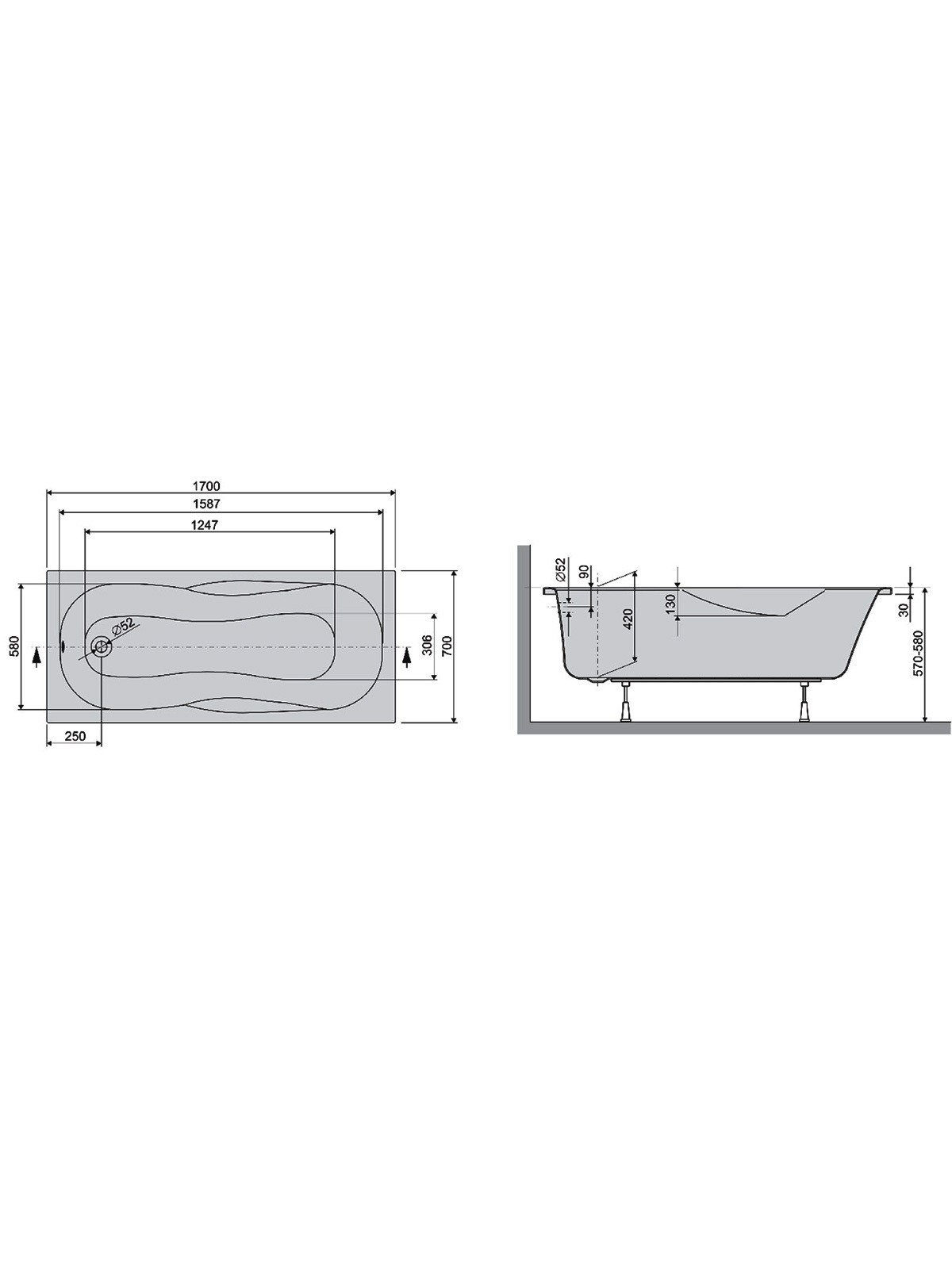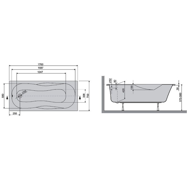 LIF17070 Life Ванна 170x70 см + ніжки, біла (1 сорт)