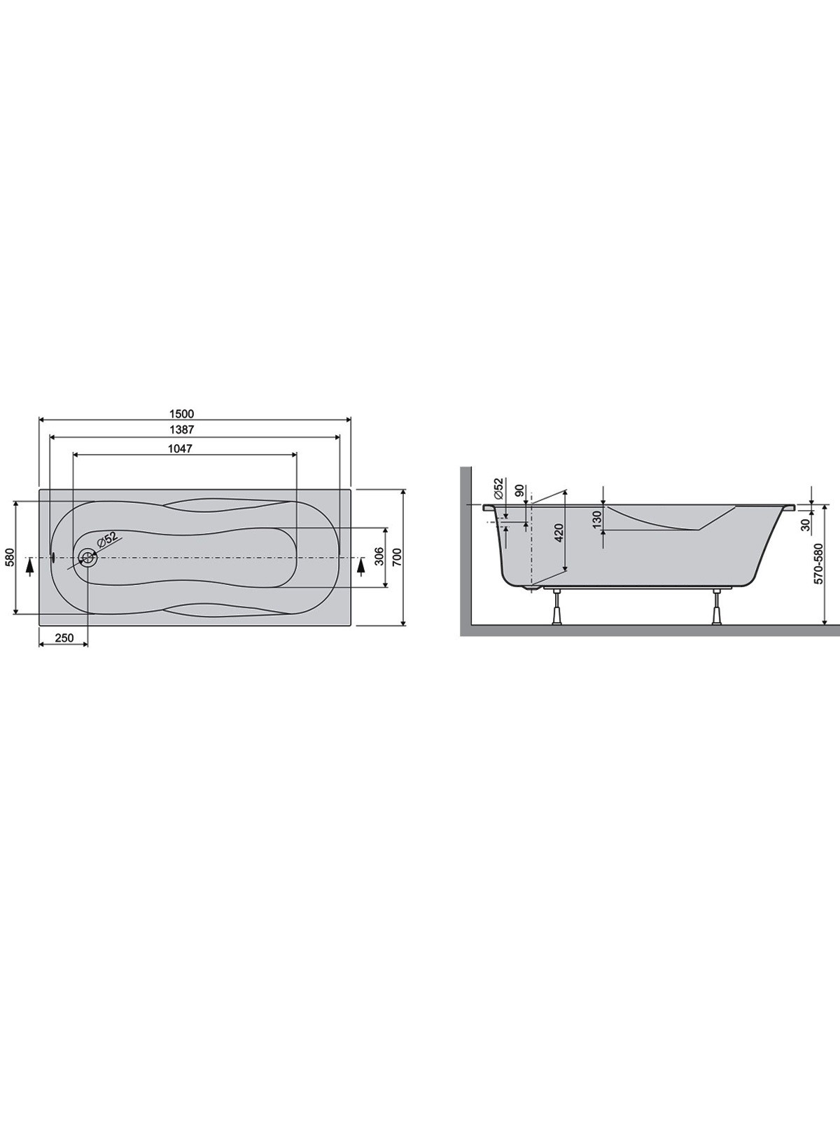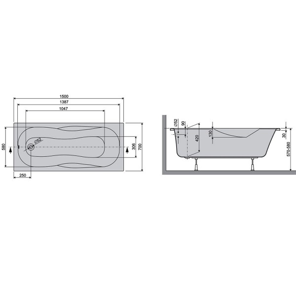 LIF15070 Life Ванна 150x70 см + ніжки, біла (1 сорт)