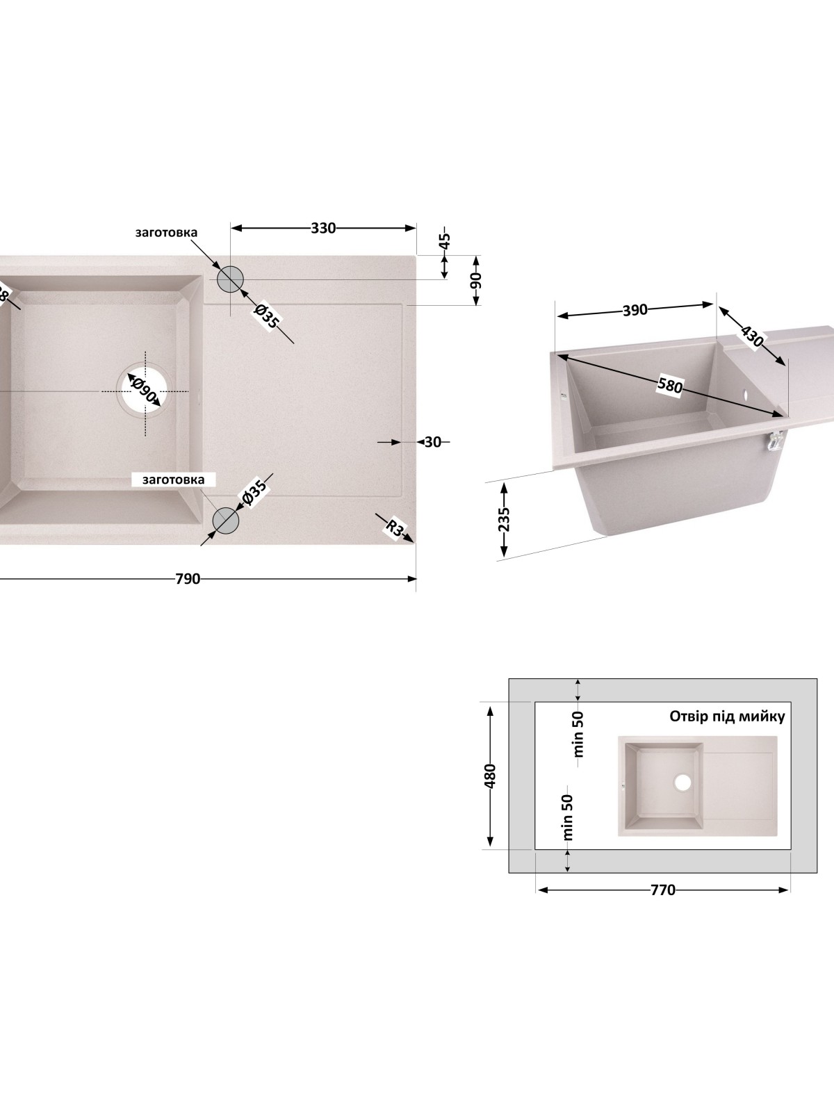 Додаткові характеристики: Намічені отвори під змішувач – 2 шт.