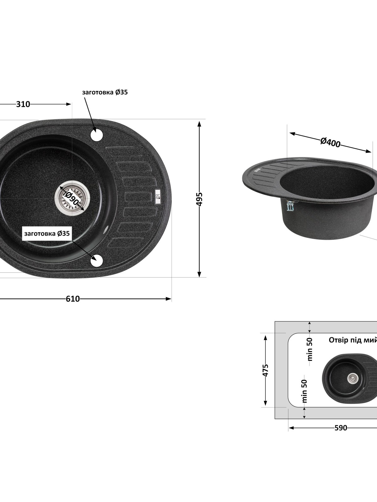 Комплектація: Мийка, сифон, злив/перелив, корзинчастий вентиль, кріплення.