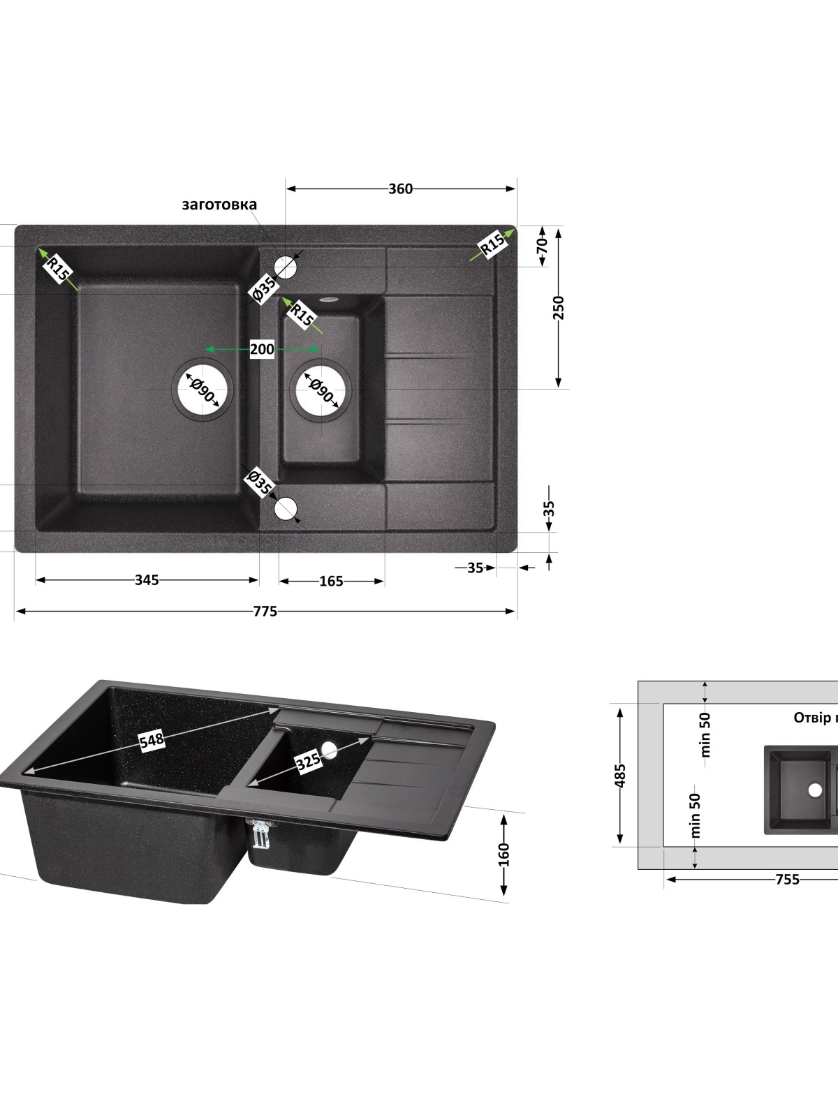 Комплектація: Мийка, сифон, злив/перелив, корзинчастий вентиль, кріплення.