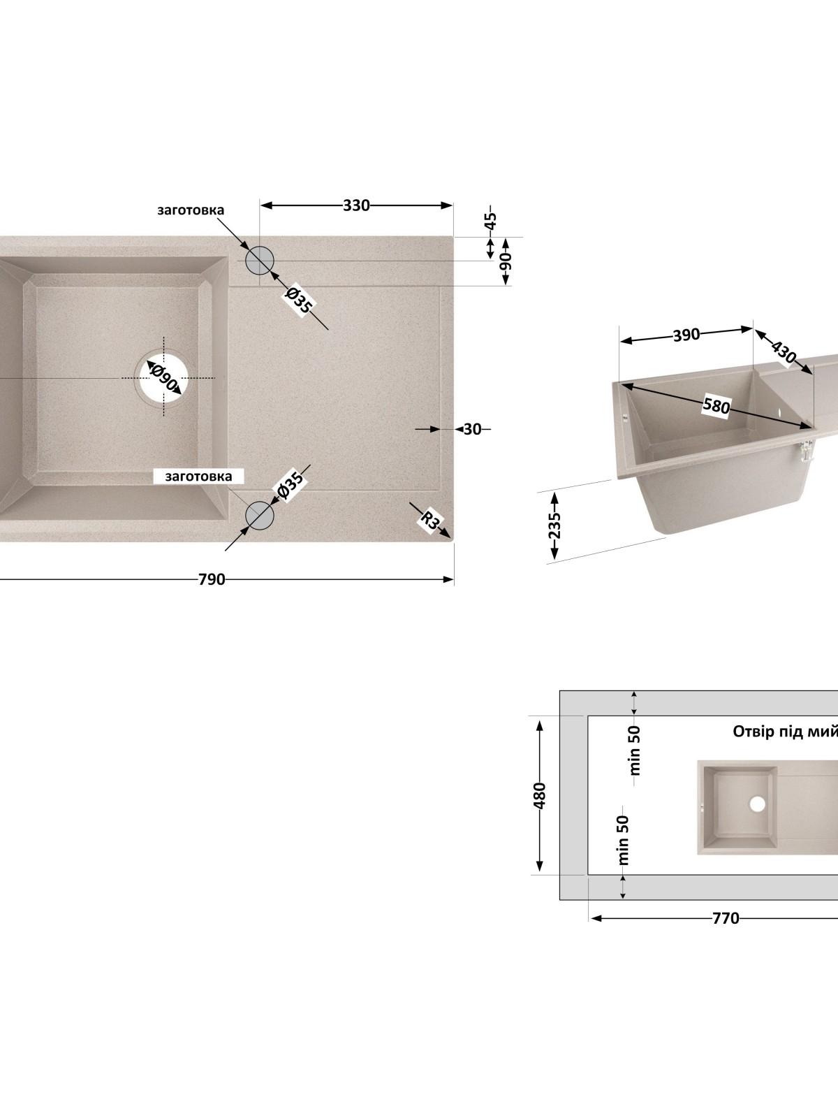 Додаткові характеристики: Намічені отвори під змішувач – 2 шт.