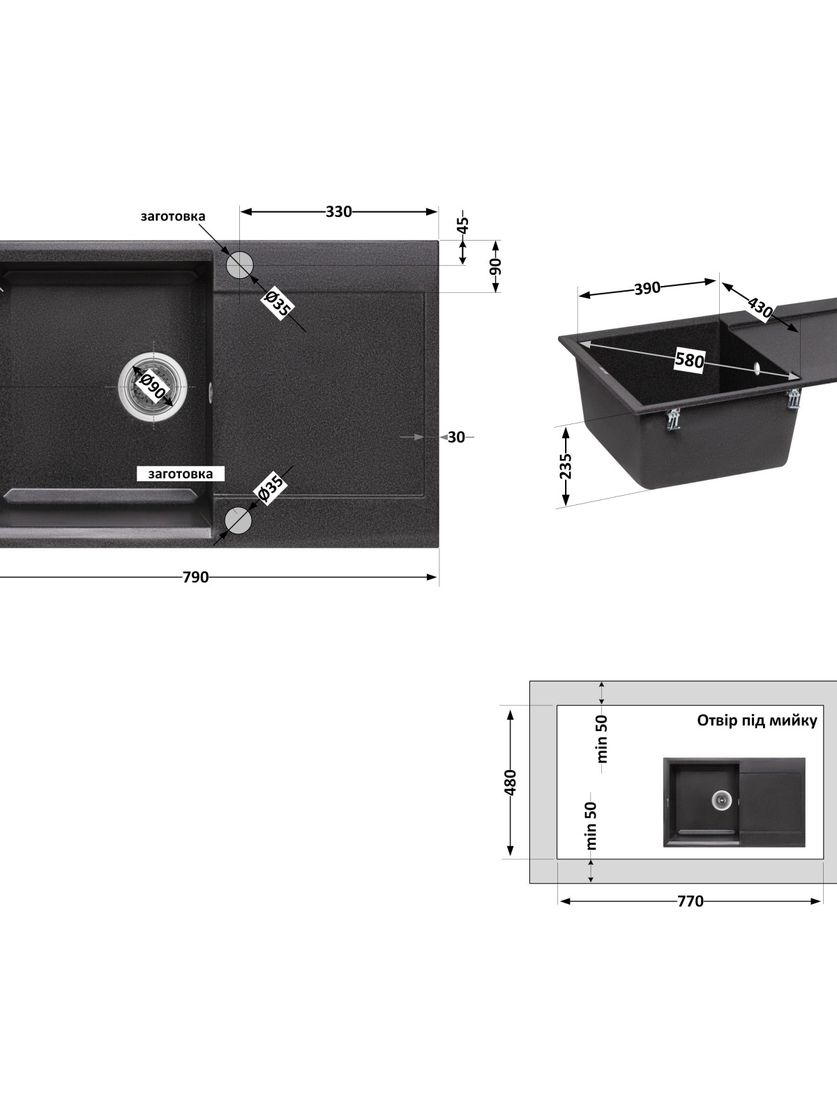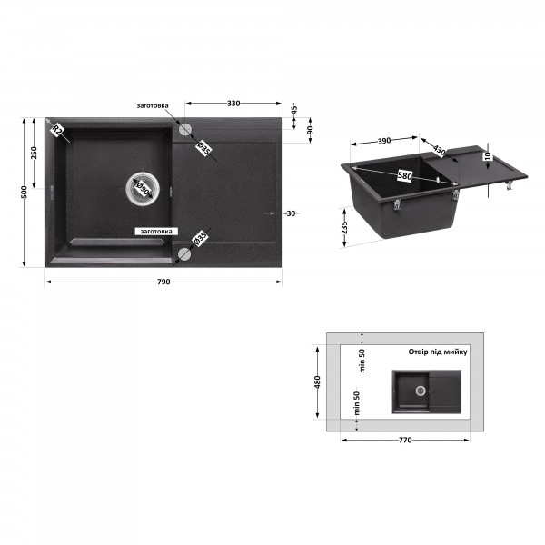 Комплектація: Мийка, сифон, злив/перелив, корзинчастий вентиль, кріплення.