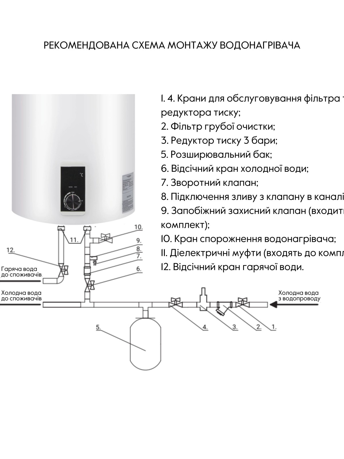 Комплектація: Водонагрівач, кабель з євровилкою, комплект кріплення, інструкція, гарантійний талон, запобіжний клапан