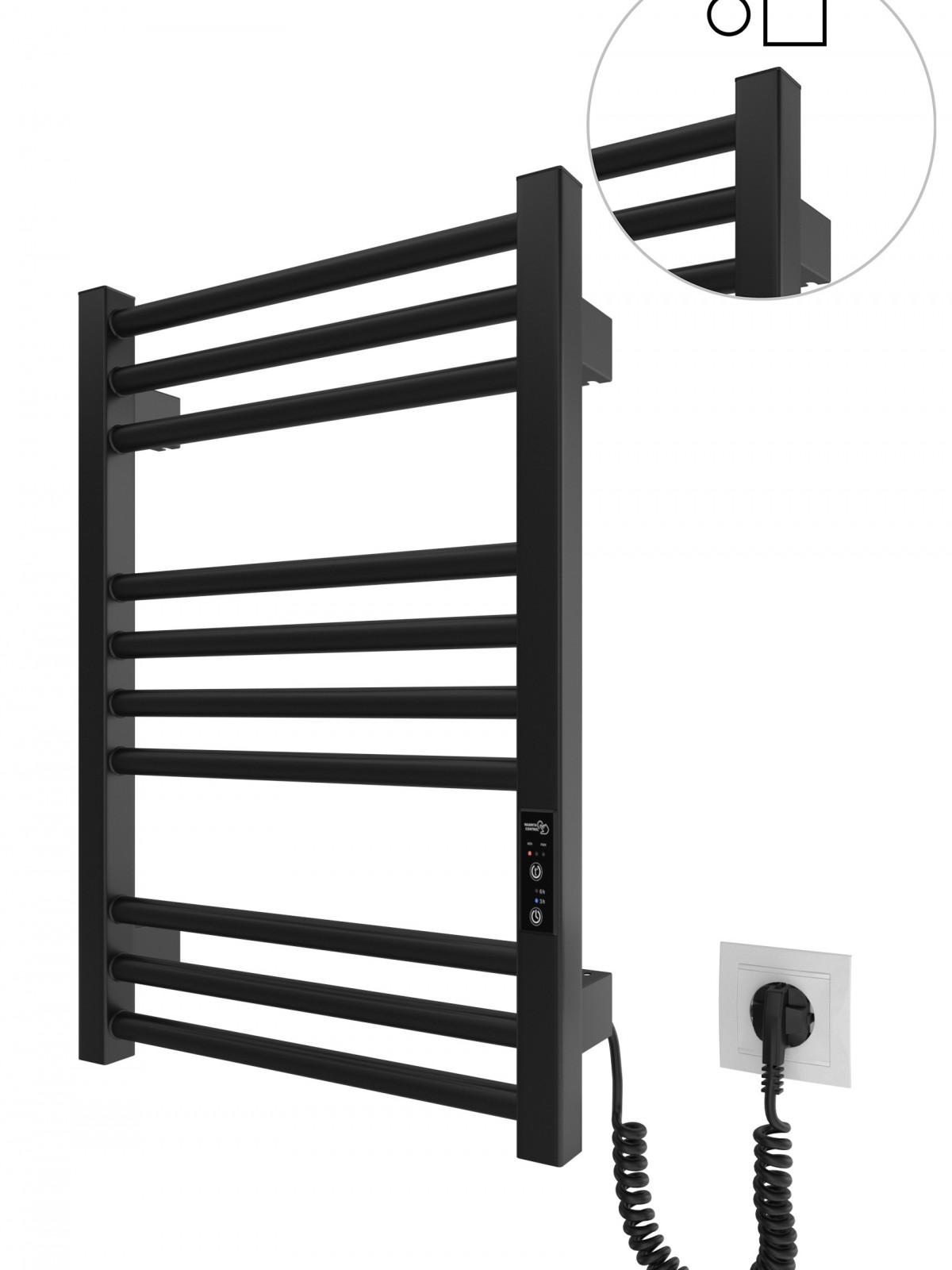 Працює за технологією сухого ТЕНу. Обладнана вбудованим таймер-регулятором і конектором для підключення до живлення з будь-якого боку. Оснащена комплектом для прихованого підключення.