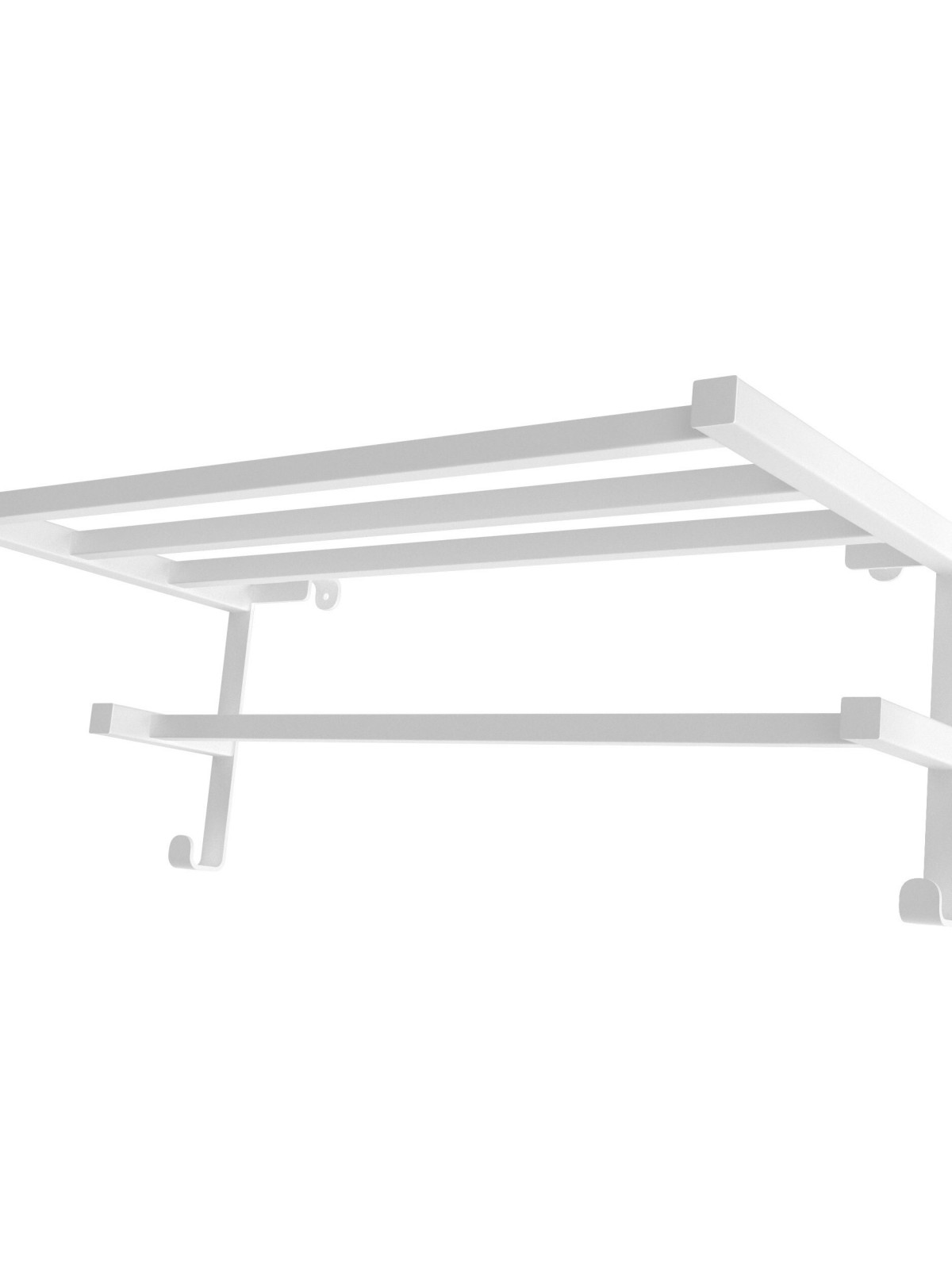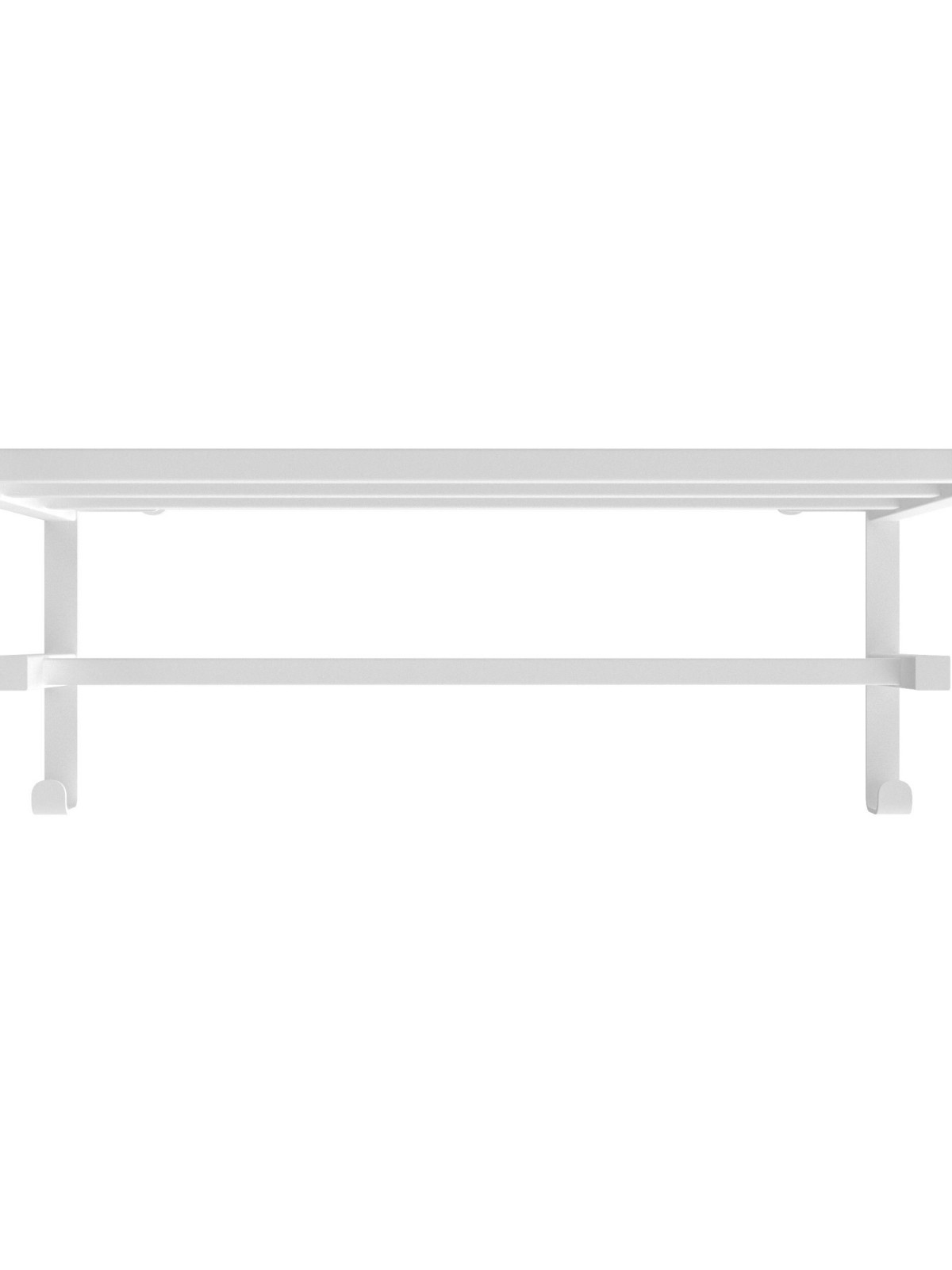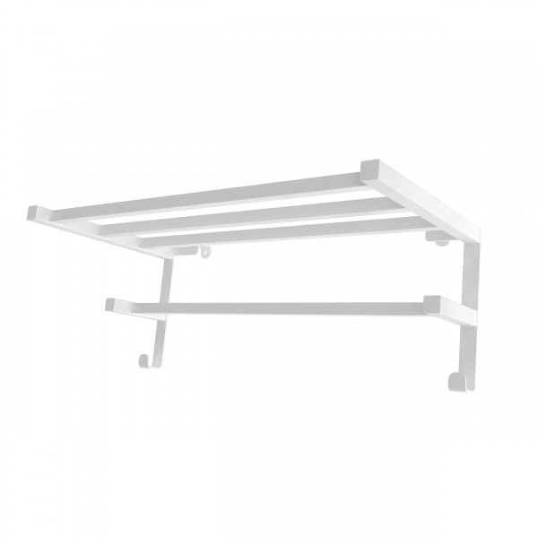 Полиця також має гачки та додаткові перемички, які можна використовувати як для зберігання, так і для висушування рушників та речей.