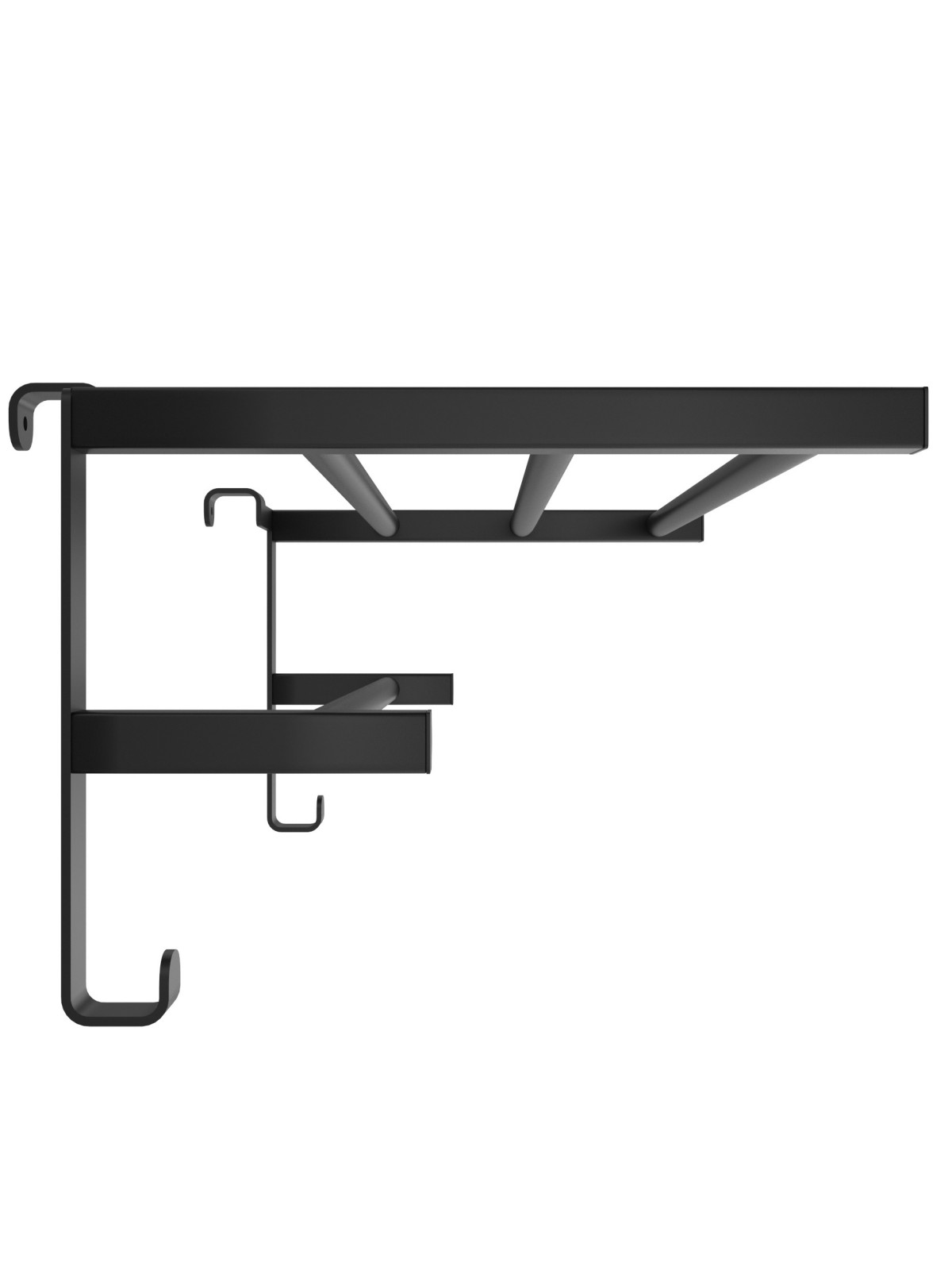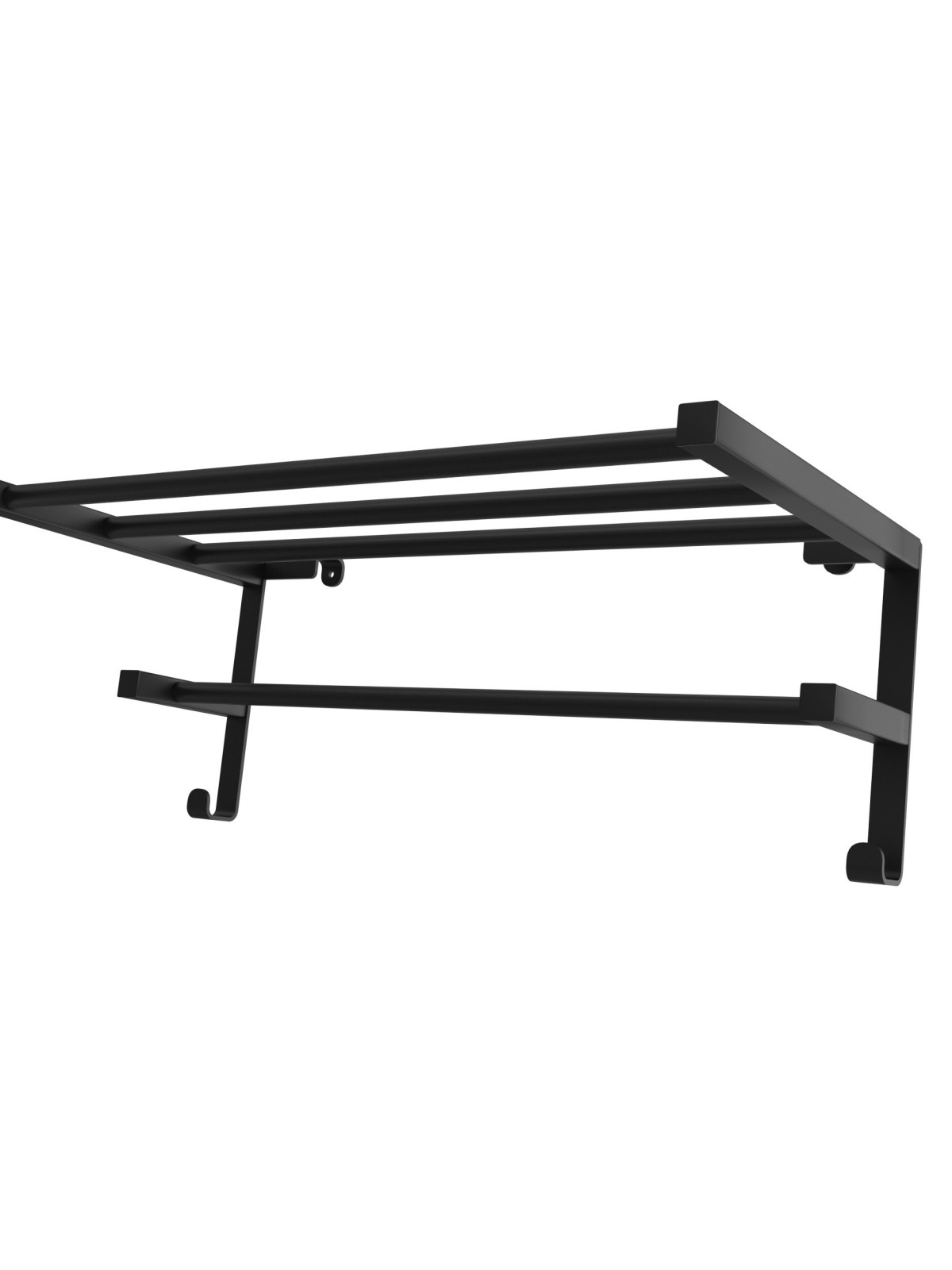 Полиця також має гачки та додаткові перемички, які можна використовувати як для зберігання, так і для висушування рушників та речей.