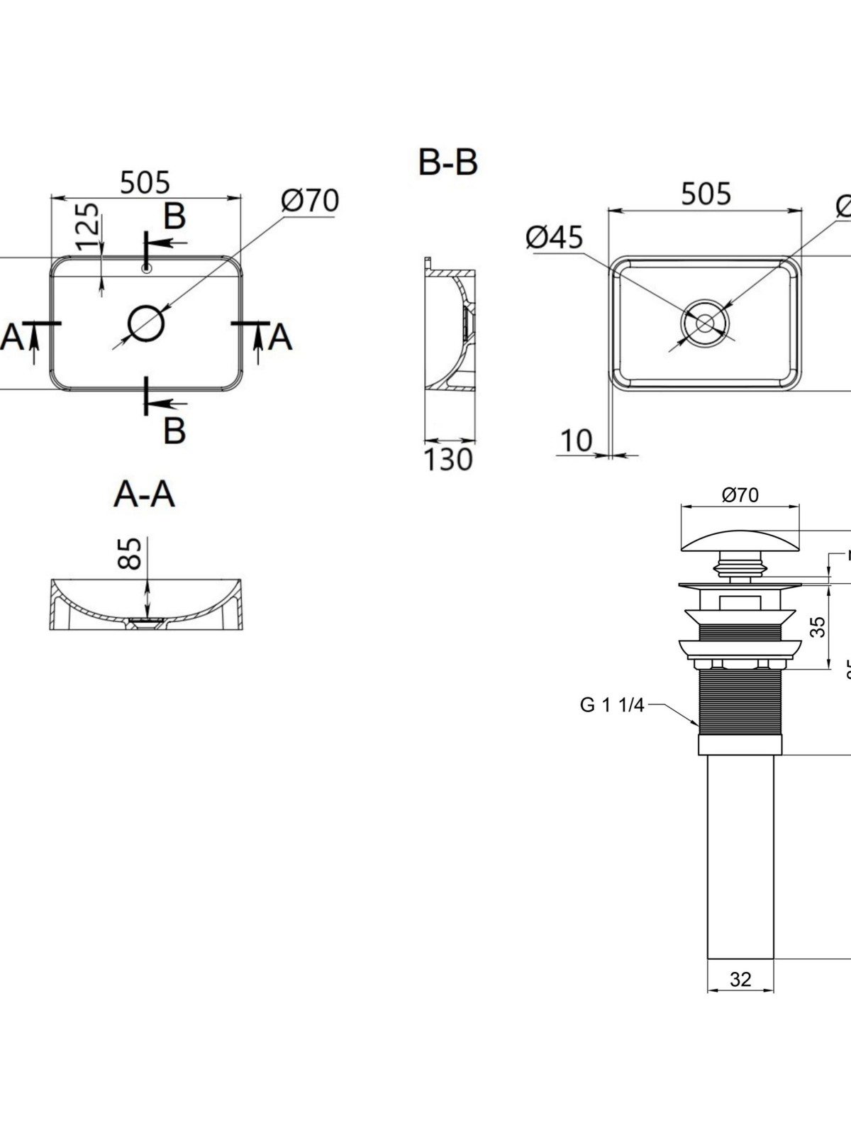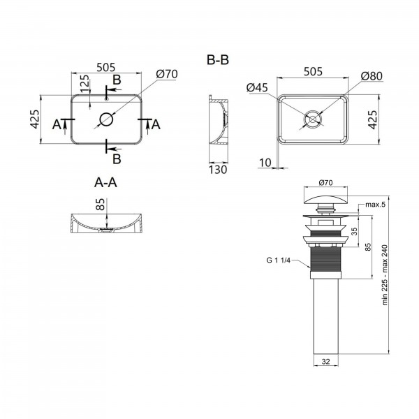 Габаритні розміри виробу (ШхГхВ), мм: 500х420х130 - раковина; 70х70х225 - донный клапан
