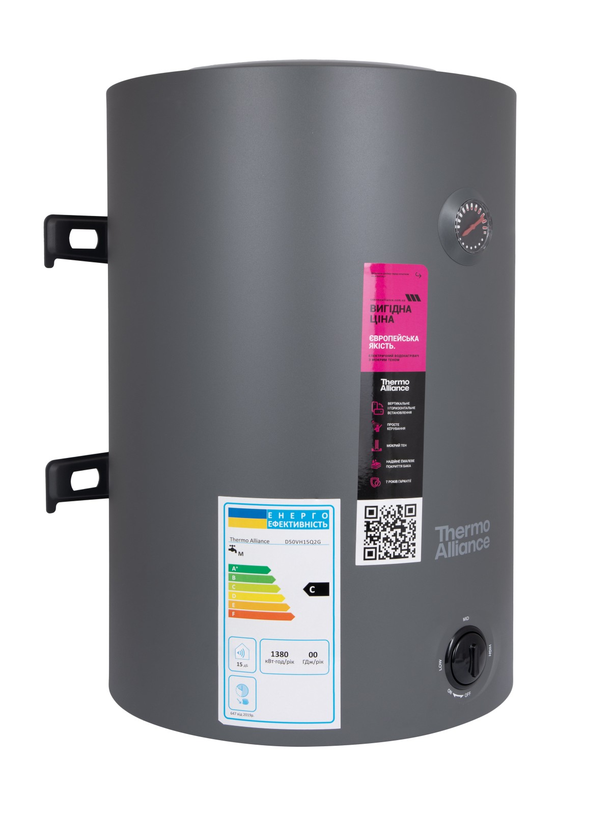 Електричний водонагрівач Thermo Alliance об’ємом 100 л у сірому кольорі namp;#8212; універсальна модель з можливістю вертикального або горизонтального монтажу, оснащена «мокрим» ТЕНом потужністю 1,5 кВт для стабільного та рівномірного нагріву води. Надійний бак із внутрішнім антикорозійним захистом, ефективна теплоізоляція та продумана конструкція забезпечують економне споживання електроенергії, довговічність і комфорт щоденного користування.