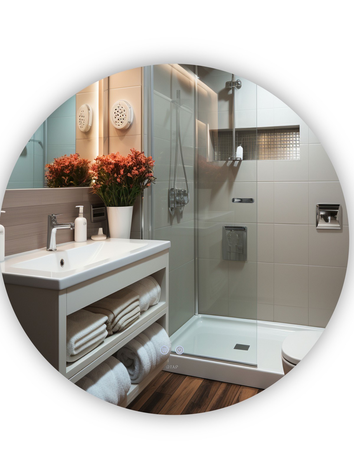 Дзеркало настінне кругле з LED-підсвічуванням Qtap Taurus R800 - це елегантне рішення для ванної кімнати. Сенсорне керування, функція антизапотівання, димер та регулювання температури кольору (3000-6500K) забезпечують комфорт та зручність використання.